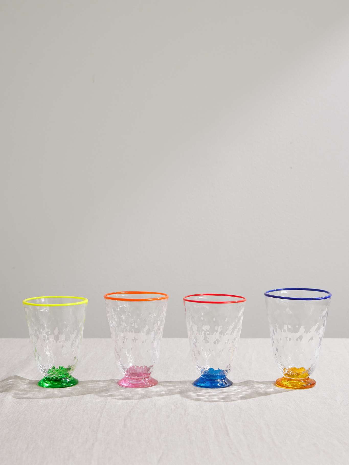 La DoubleJ's glasses have been handblown in Venice from Murano glass. Each is rippled to mirror a 'quilted' texture and features a boldly coloured rim and base.