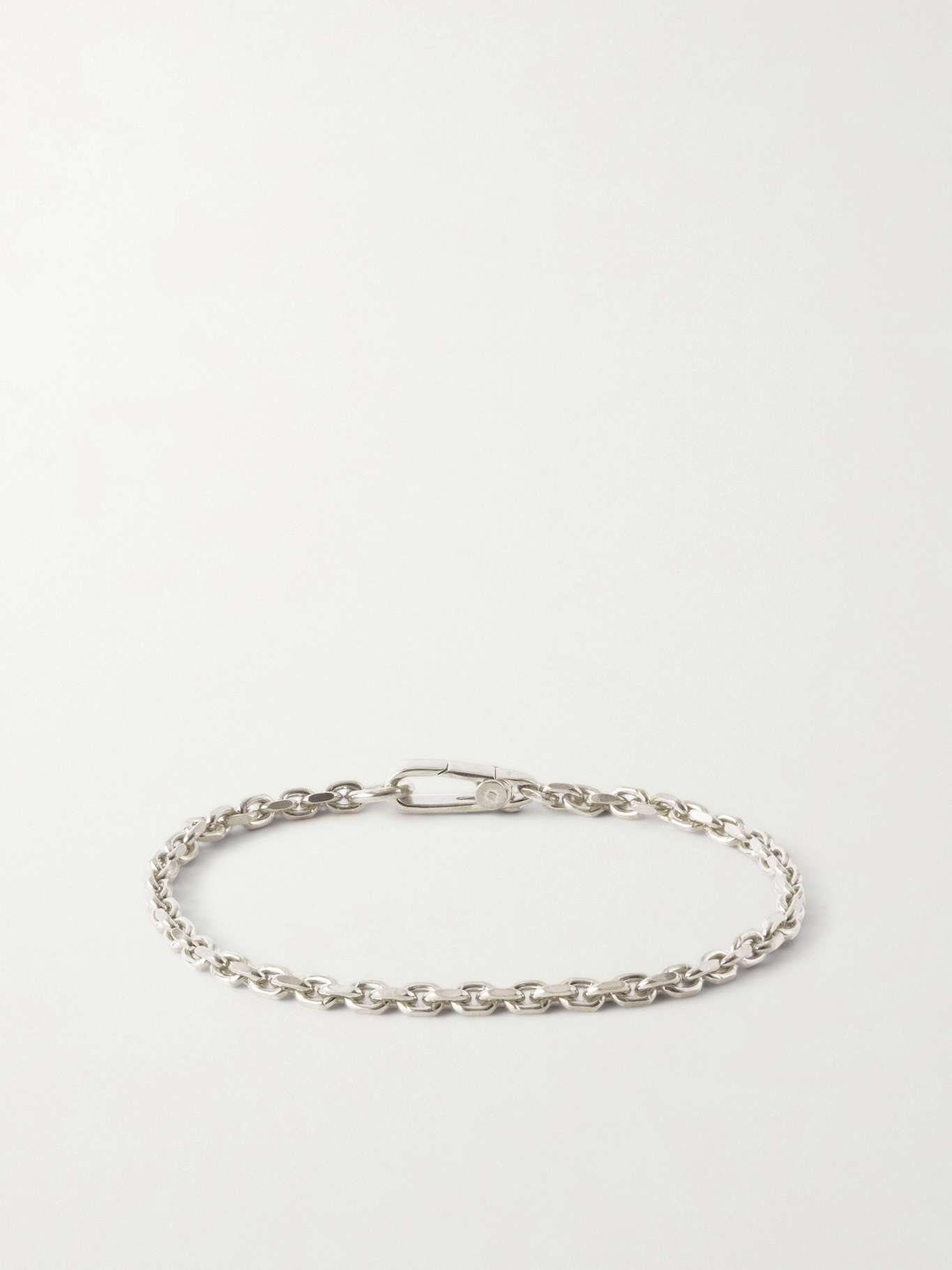 Mikia’s bracelet favours clarity of form. Made from sterling silver and detailed with sapphire accents along a fine chain, it introduces a restrained flash of colour to the minimalist design.