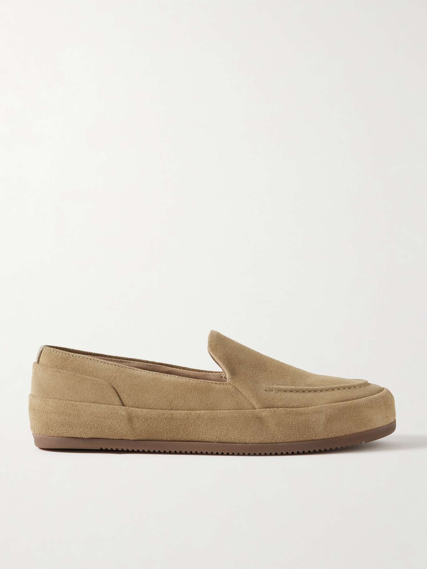 Mulo's shoes are designed in London using "the DNA of a traditional Oxford shoe last". Designed with stitched apron toes, these handmade suede loafers have soft fleece footbeds and covered midsoles for a streamlined look.