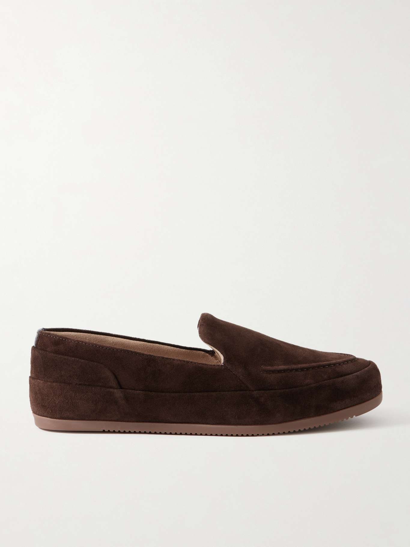Mulo's shoes are designed in London using "the DNA of a traditional Oxford shoe last". Designed with stitched apron toes, these handmade suede loafers have soft fleece footbeds and covered midsoles for a streamlined look.