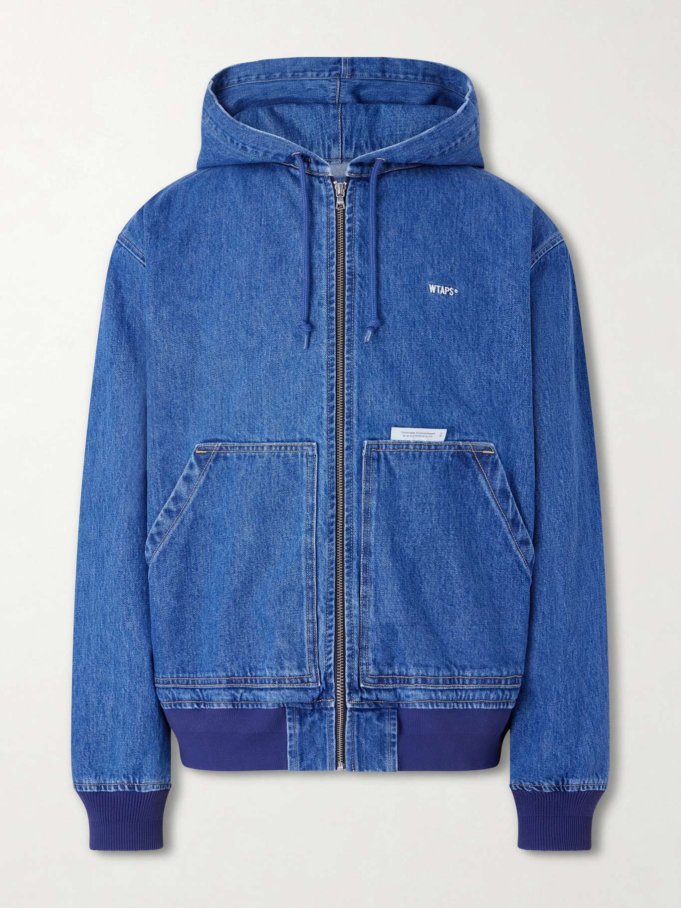 WTAPS®' 'D00M' jacket is cut from cotton denim, giving it a structured yet softened handle through wear. Shaped with a hood and ribbed trims, it features a zip front and curved pocket detailing that lends the silhouette a functional, slightly rounded profile.
