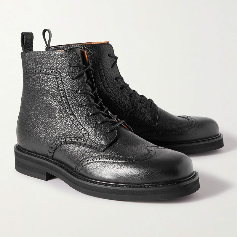 If we were really picking holes – literally in this case – we would say that “brogue” refers to a detail: the perforations designed to drain water from the feet of our Gaelic ancestors when crossing boggy terrains. However, whether in an Oxford or Derby style, a brogue is very much a shoe in its own right. Wingtips are a brogue with a decorative detail on an extended toecap. Cap toes are brogues with a plain toe, although often with perforations along the edge of the cap. Try box calf leather, suede or Scotch grain, depending on how relaxed you want to go.