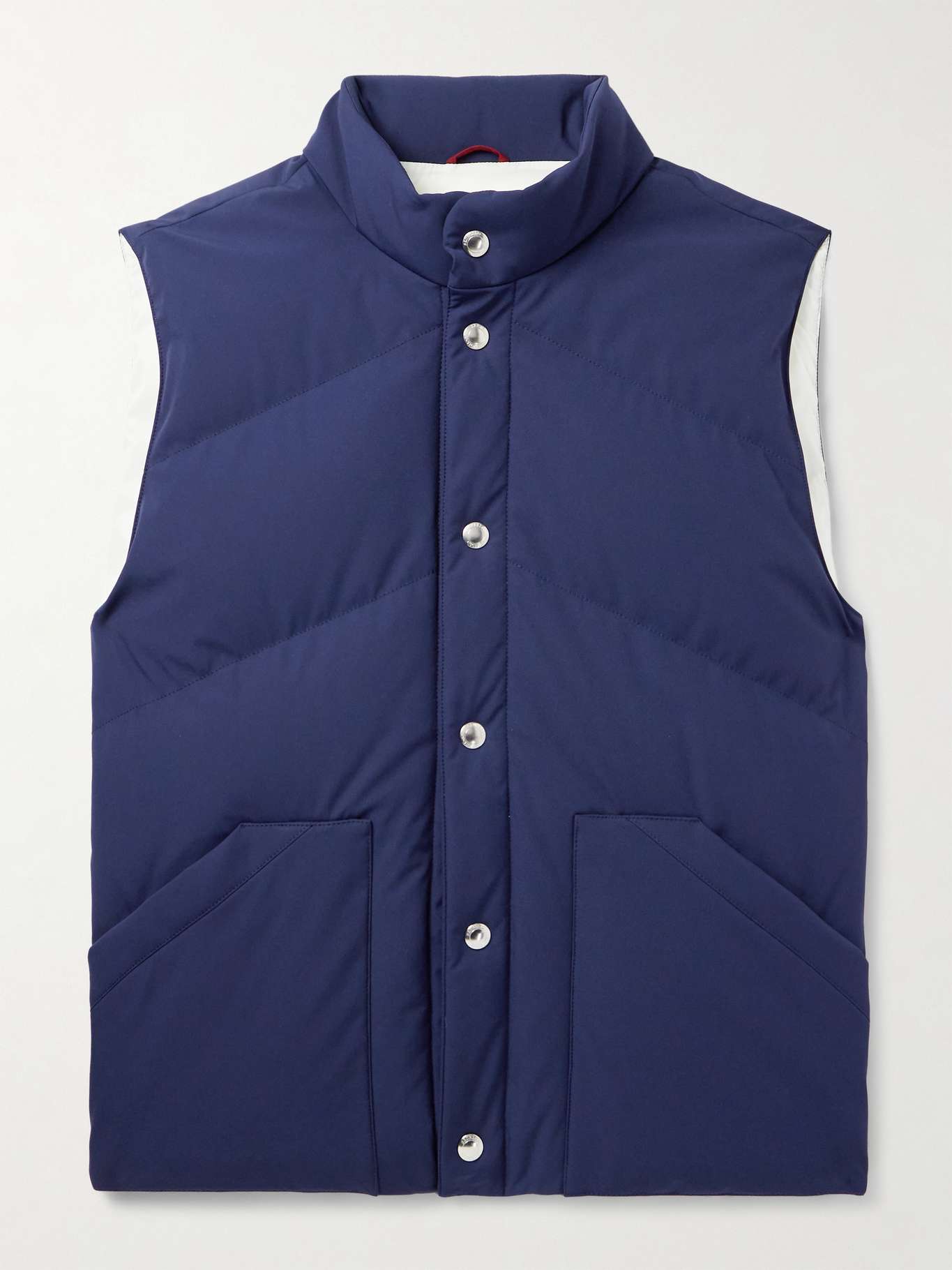 EXCLUSIVE AT MR PORTER. Brunello Cucinelli's gilet is designed with diagonal quilting to keep the insulating down fill evenly distributed around your core. It's been made in Solomeo, Italy, from lightweight, durable shell and fastens with logo-engraved silver-tone snaps.