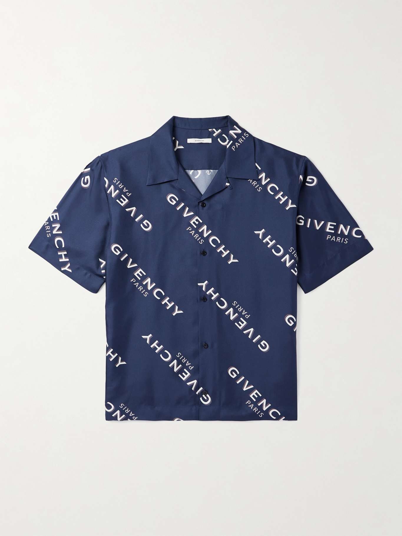Givenchy's shirt has the same convertible collar and boxy cut as retro bowling styles. It's been made in Italy from fluid silk-twill and is printed with a repeating logo in a bold drop shadow font.