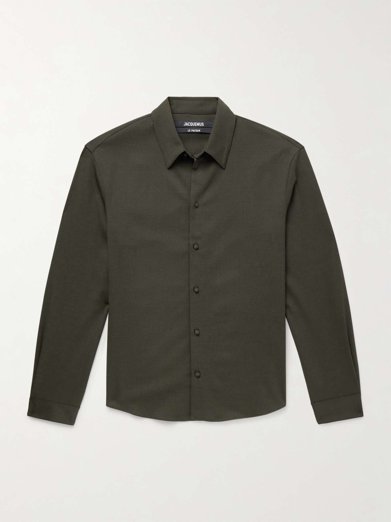 The back of Jacquemus' 'Mondani' shirt is appliquéd with a 'J' in place of a traditional locker loop. It's been made in France from virgin wool with a hint of stretch and has a classic collar and covered buttons.