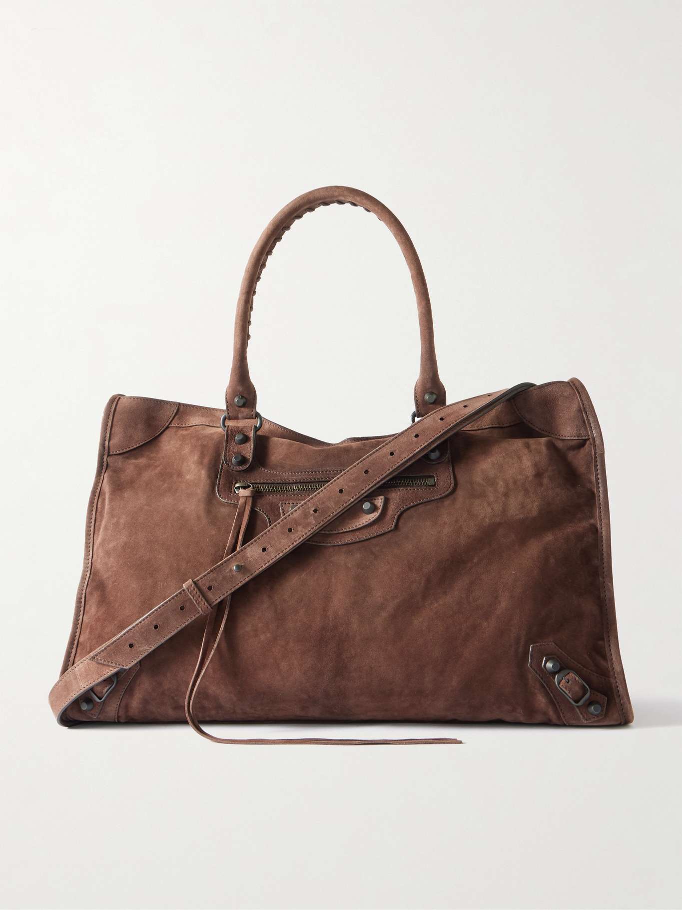 Balenciaga's 'Le City Large' tote is one of its most iconic styles. This version is made from waxed-suede that's punched with small, thimble-sized studs and is suspended from topstitched handles and an adjustable shoulder strap. Inside, there's enough space to pack for a weekend away - use the zipped pocket to store your phone, wallet and keys.