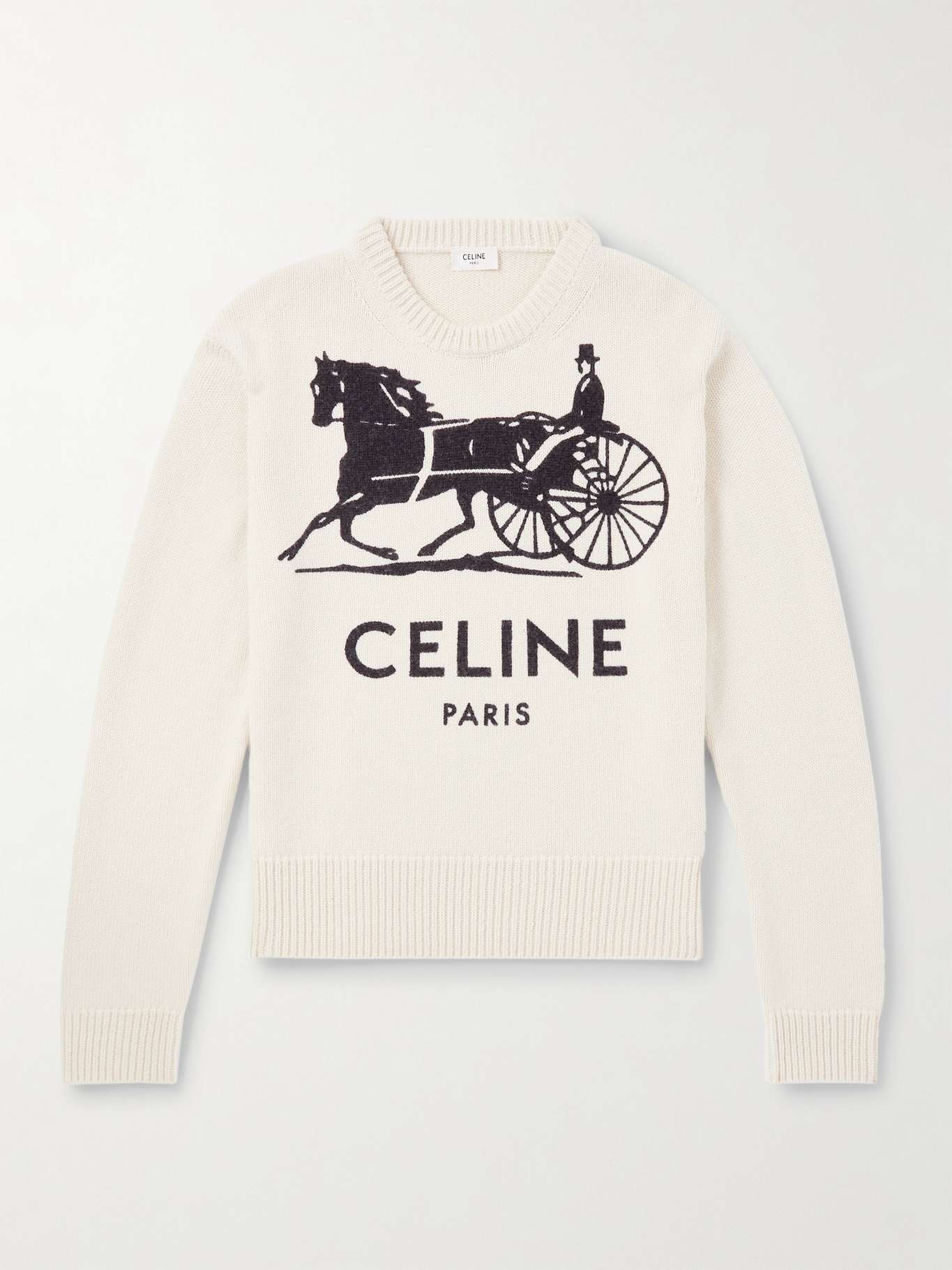 CELINE's sweater is knitted with a horse-drawn carriage - one of the French brand's oldest logos. It's made from plush cashmere, and the graphic is rendered using an intarsia technique.
