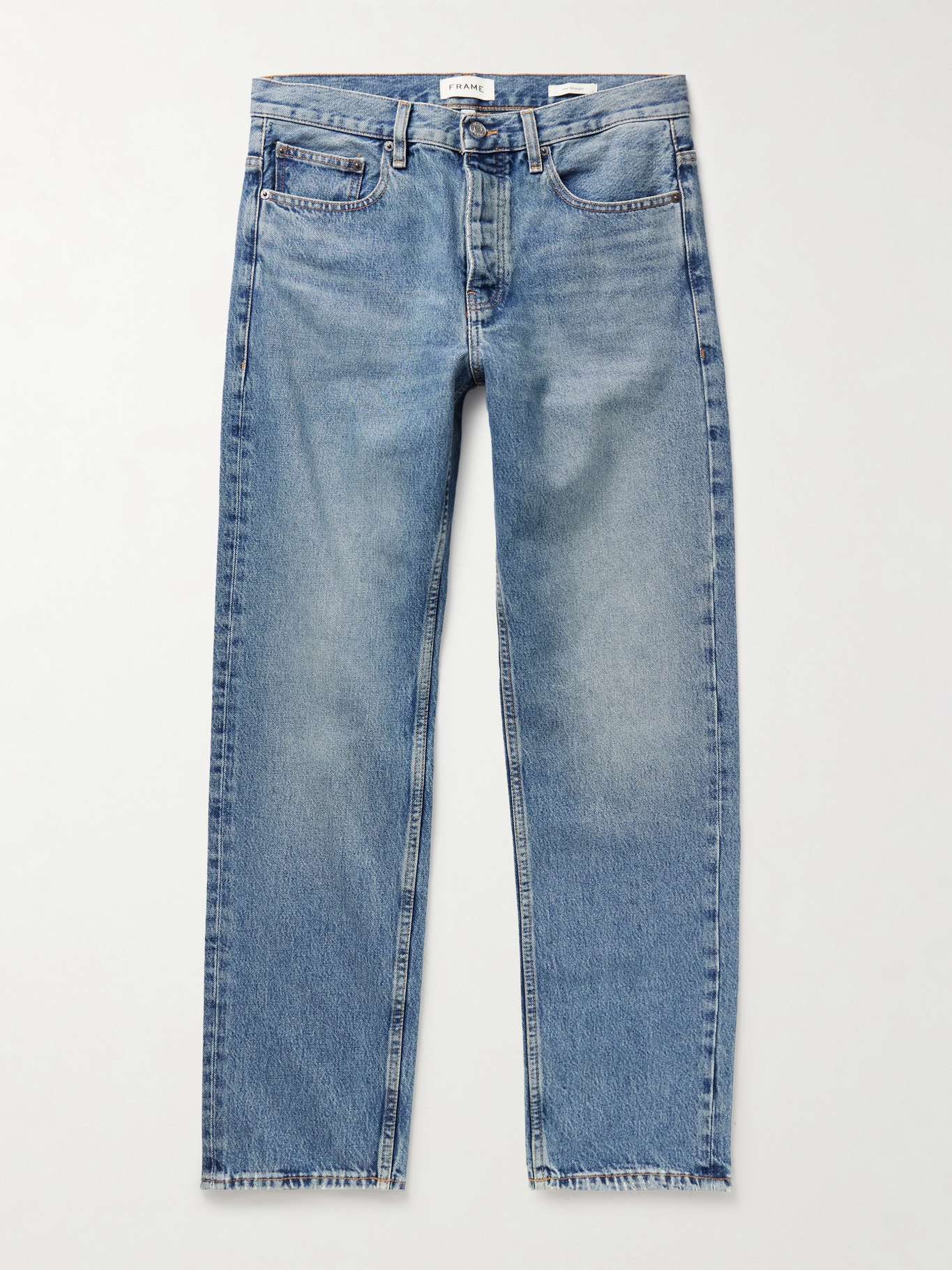 FRAME's 'The Straight' jeans are a true classic. They're cut from denim in a mid-rise, five-pocket profile with a traditional buttoned fly. The amber topstitching is selected to complement the blue 'Outfield' wash.
