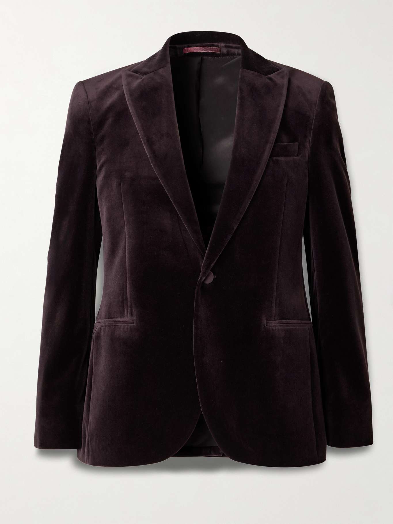 DESIGNED BY MR PORTER. Velvet is a favourite of menswear icons like Tom Ford: "Nothing takes colour as well or looks so rich," he told us. Embodying that point, this Mr P. tuxedo jacket is made from brown cotton-velvet that'll look fantastic in low light. It's cut for a slim fit and tailored with the hallmarks of eveningwear, including wide peak lapels and functioning buttoned cuffs.