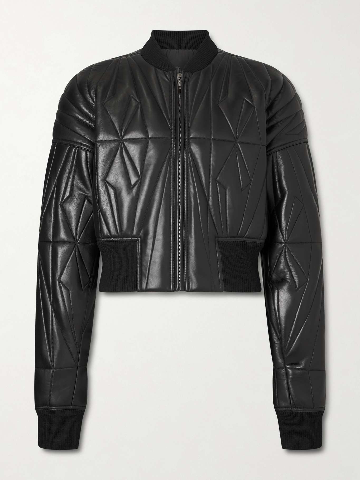 This jacket is the result of Rick Owens' creative partnership with Moncler. Made from soft black leather, it has geometric quilting throughout and falls to a gently cropped hem. Chunky ribbed trims frame the shape.