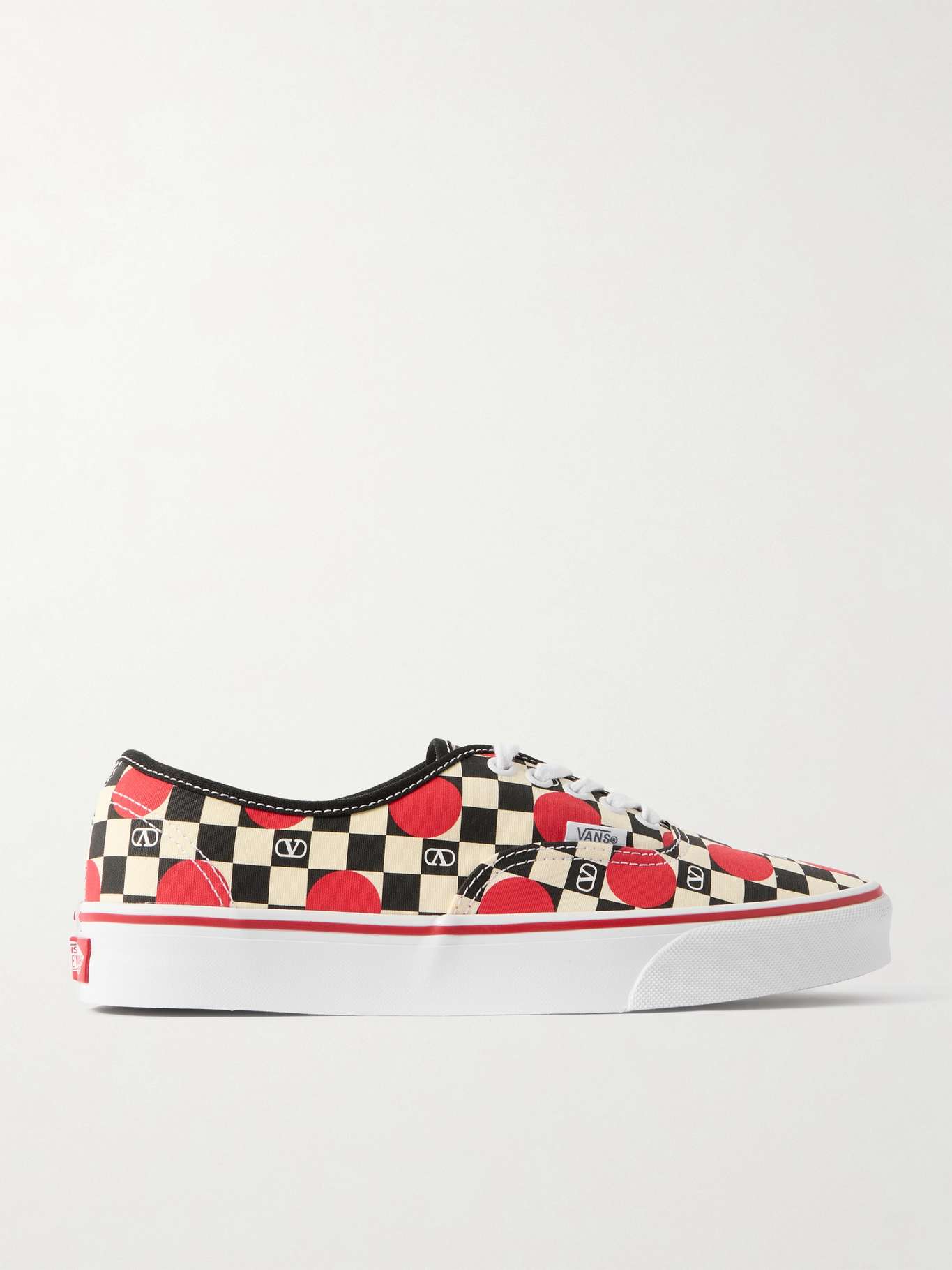Vans introduced its checkerboard in the mid-'70s when Steve Van Doren, son of legendary co-founder Paul, noticed his classmates' sketching tiles on the soles of their shoes. Part of its collaboration with Valentino Garavani, these sneakers are made from canvas and printed with the iconic motif, layered with 'VLogos' and bright-red spots.