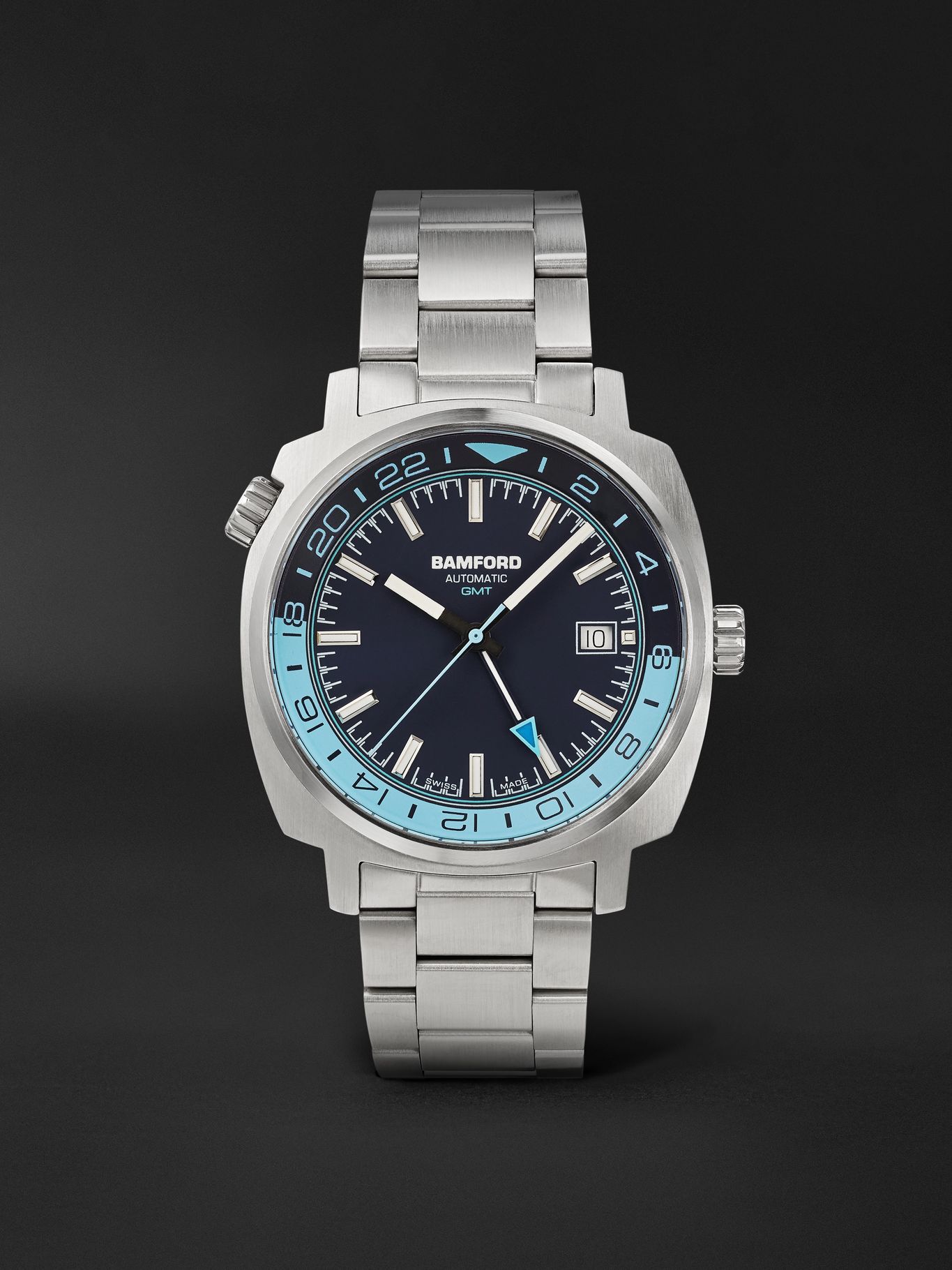Bamford London's 'GMT' watch has an extra hand and rotating bezel to track additional time zones. Engineered in the UK from stainless steel, this model redesigns the original movement with a powerful 56-hour reserve. The matching bracelet is a practical choice.