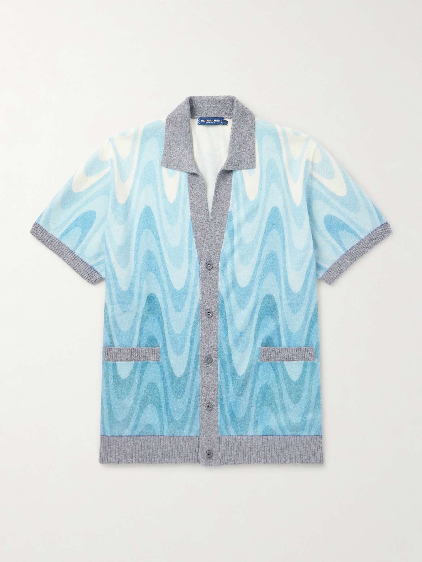 Frescobol Carioca's short-sleeved cardigan is patterned with a 'Copa Grain' design, characterised by swirling shades of 'Coastal Blue'. It's made from a blend of wool and cashmere, which has been brushed for added softness.