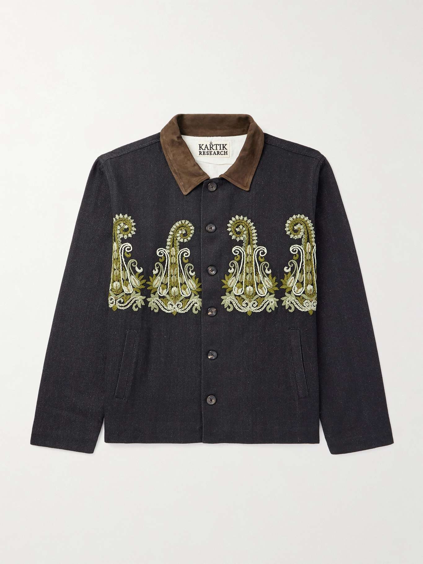 Before launching Kartik Research, founder Kartik Kumra went on a road trip through India to scout out the country’s vast network of craftspeople. Showcasing their artistry, this jacket is hand-embroidered with a beaded swirling pattern across the chest. It has a suede collar and a welt pocket on each side.