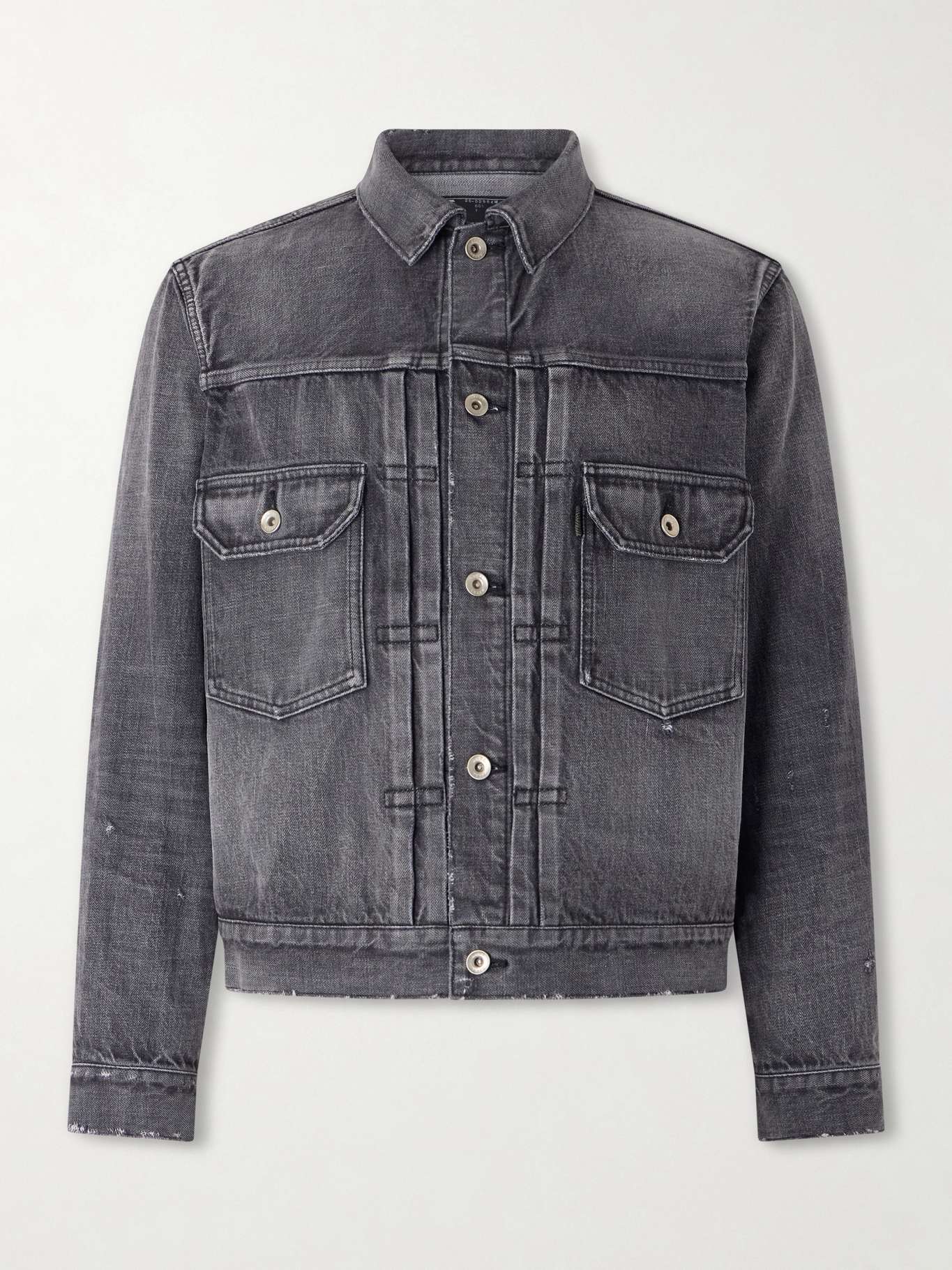 Sacai's jacket is designed in collaboration with denim specialists BEYONDEXX. It's cut for a relaxed boxy shape with dagger pleats along the placket and is faded and distressed for a vintage look.
