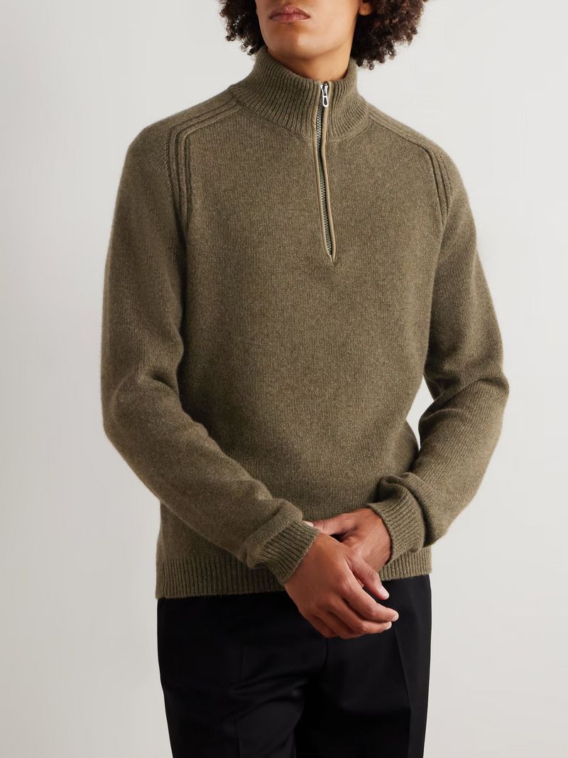 Then there’s the other kind. “Fashion-forward examples that blend luxurious materials – cashmere, alpaca, mohair, angora – with interesting tones,” as Browne puts it. He frames this second variety as more than merely a quarter zip, but a “quarterback – the star player”. And it’s this MVP incarnation that is “giving the quarter zip a great rep at present”.