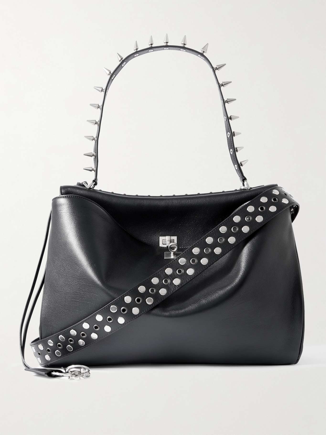 Balenciaga's 'Rodeo' tote is eye-catching, spacious and functional - all the makings of a firm favourite. Crafted in Italy from smooth leather, it has gleaming silver-tone hardware and a detachable, studded shoulder strap. The expandable sides ensure there's plenty of room for the essentials, including a laptop, book and water bottle.
