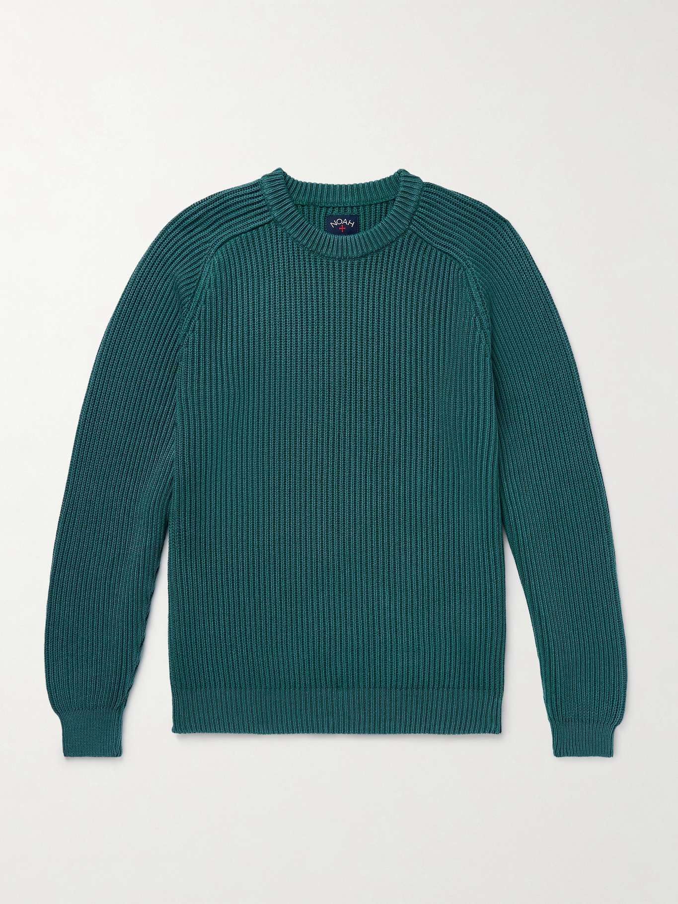 Noah's sweater is knitted in a shaker stitch, resulting in a ribbed finish and soft, spongy handle. It's made from organic cotton in a deep teal shade perfect for cold-weather months.