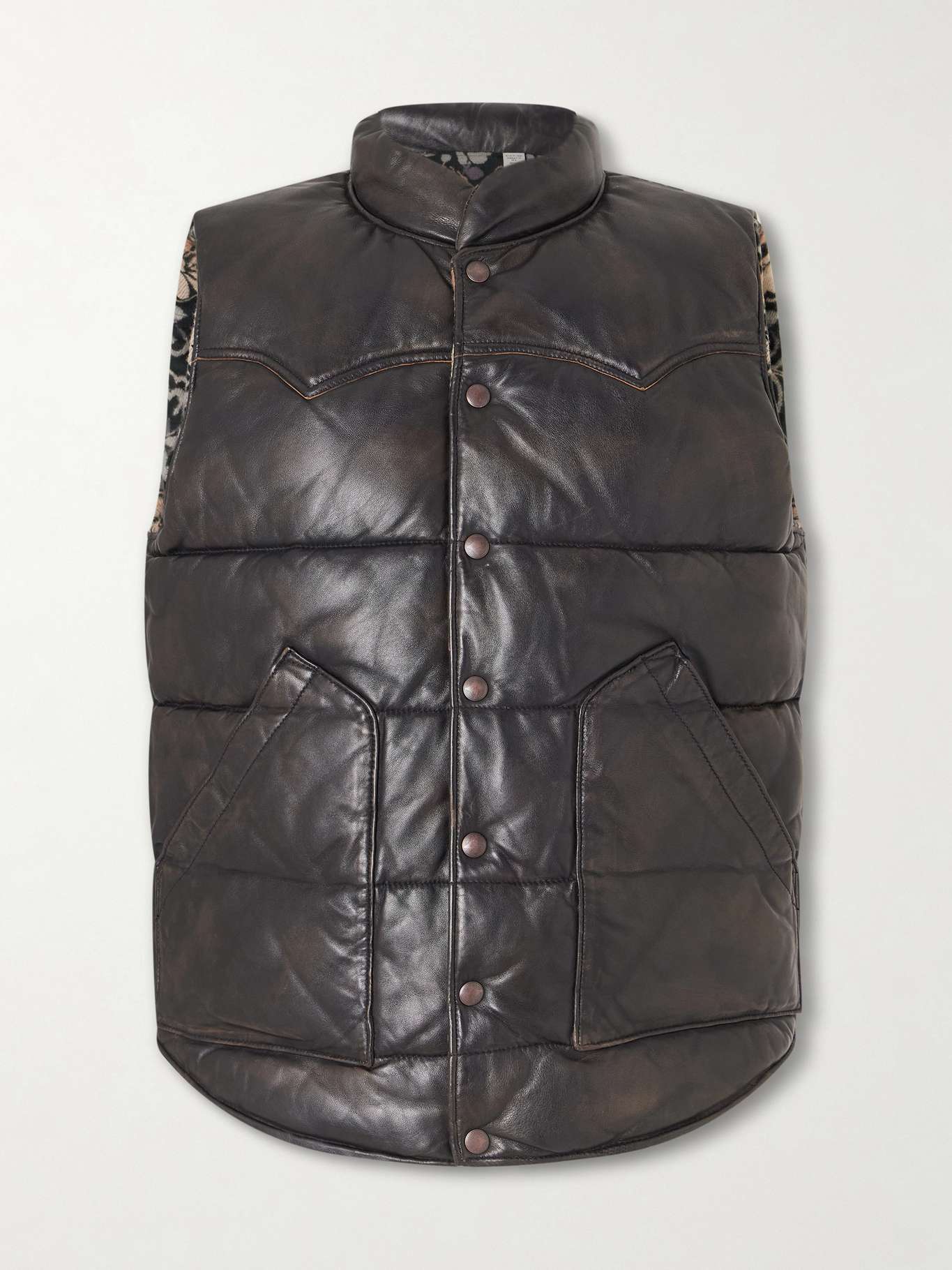 The reversible design of RRL's gilet gives you two looks in one. Cut from supple leather that's padded and quilted for warmth, it has a floral cotton-jacquard reverse. The pointed Western-style yokes and distressed details nod to the mood of life on the founder's Colorado ranch.