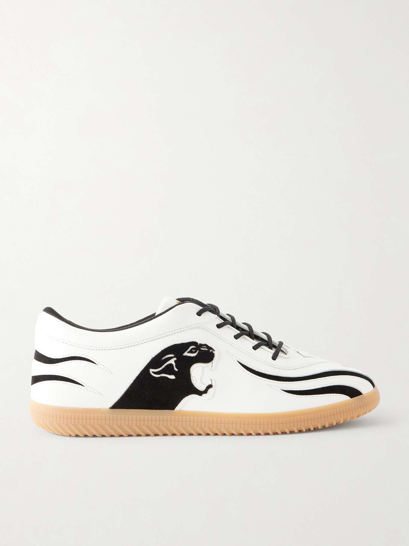 Valentino Garavani's 'Kicky' sneakers feature a suede panther on the uppers and matching flame streaks on the toe and heel. Made in Italy from smooth leather, they sit on gripped gum soles and have branded 'VLogo' hardware on the tongue.