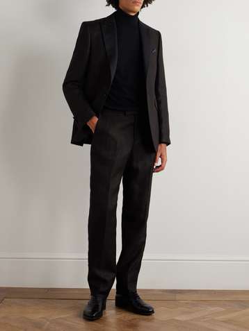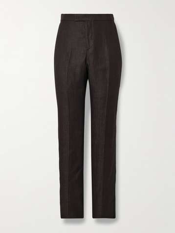 Randwick Straight-Leg Grosgrain-Trimmed Herringbone Linen and Silk-Blend Tuxedo Trousers