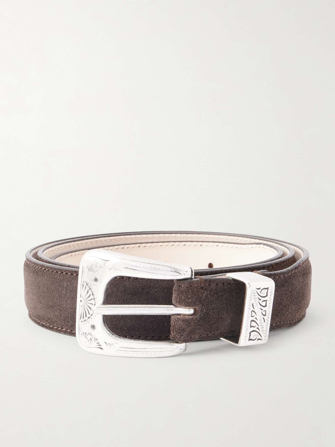 Drake's belt is more than a necessity; it's a distinctive finishing touch that's grounded in hand-finished artistry. Crafted from plush suede, it's fully lined with smooth leather on the reverse and fitted with a silver-tone buckle and pointed tip etched with Western-inspired details. French-tuck sweaters to keep it in focus.