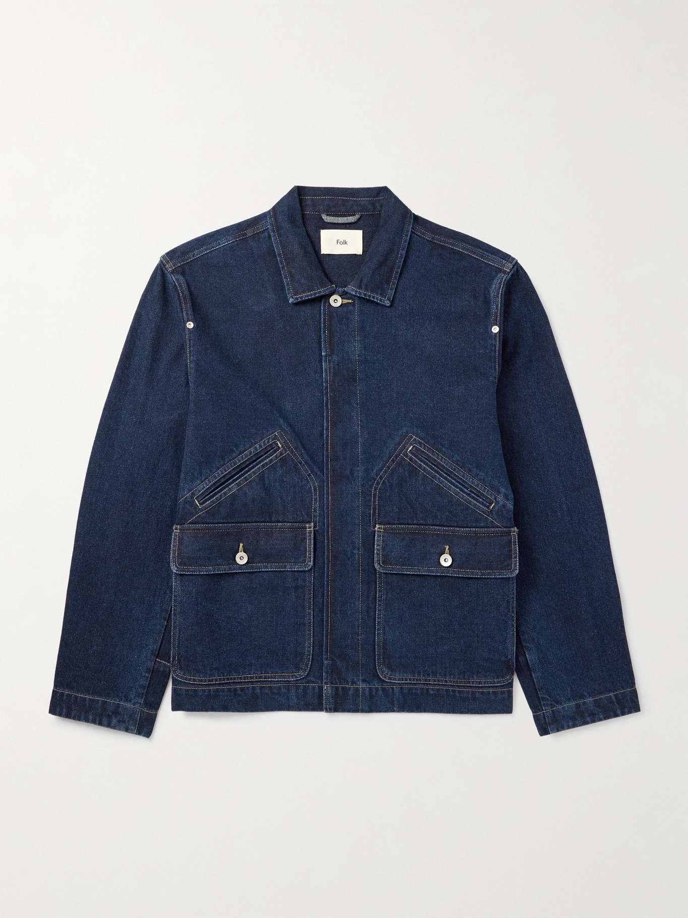 Folk's jacket is modelled on a style from its archives. It's cut in a boxy shape from deep blue denim and stone-washed to soften the handle. Inspired by vintage workwear, it's detailed with flap and angled pockets and camel-tone twin-needle stitching.