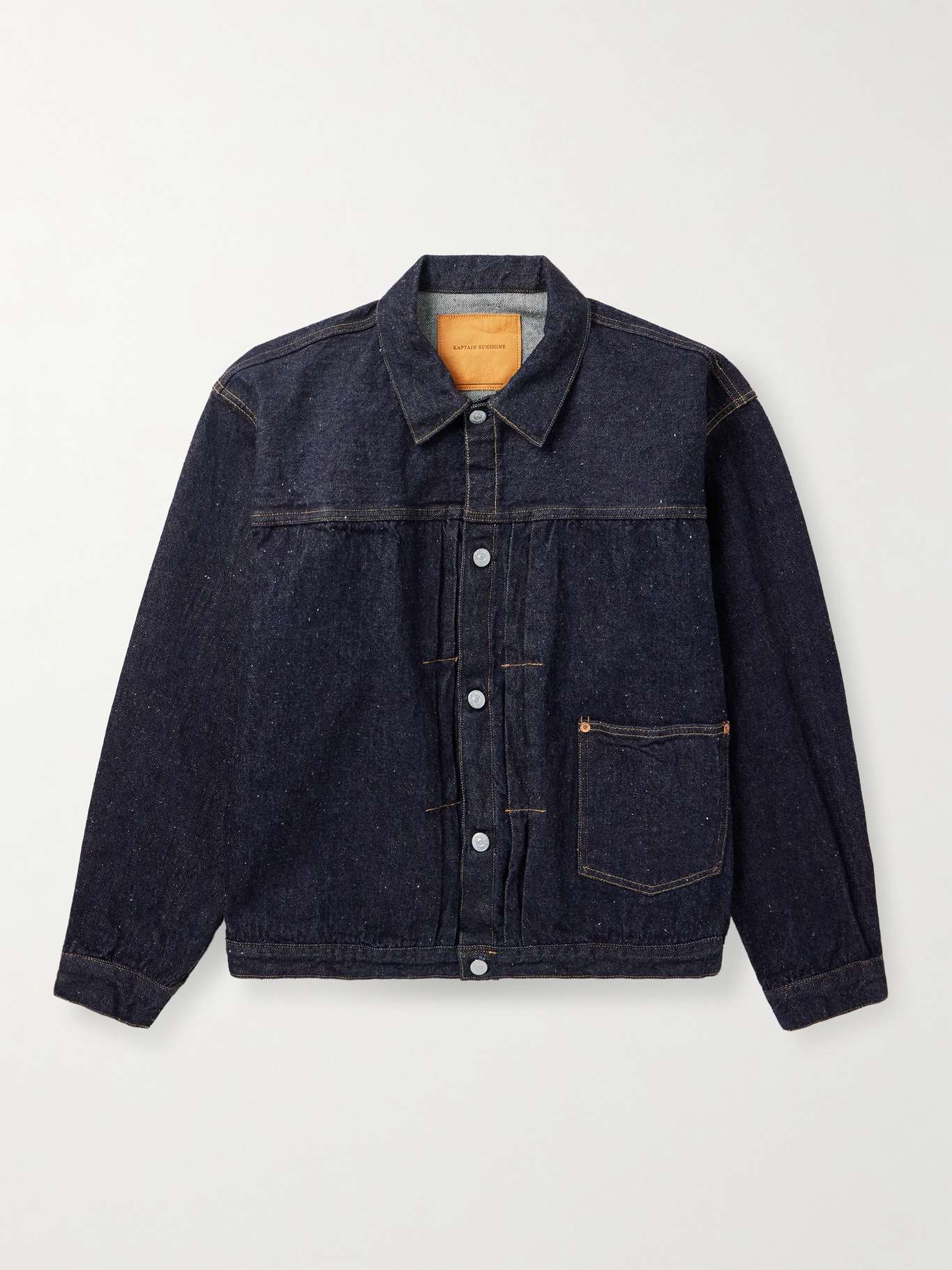 Kaptain Sunshine's jacket is made from 13.5 .oz selvedge denim that'll only get better with age. It's been made in Japan and has the hallmarks of mid-century styles, like silver-tone buttons, camel-tone stitches and an adjustable buckle at the back.