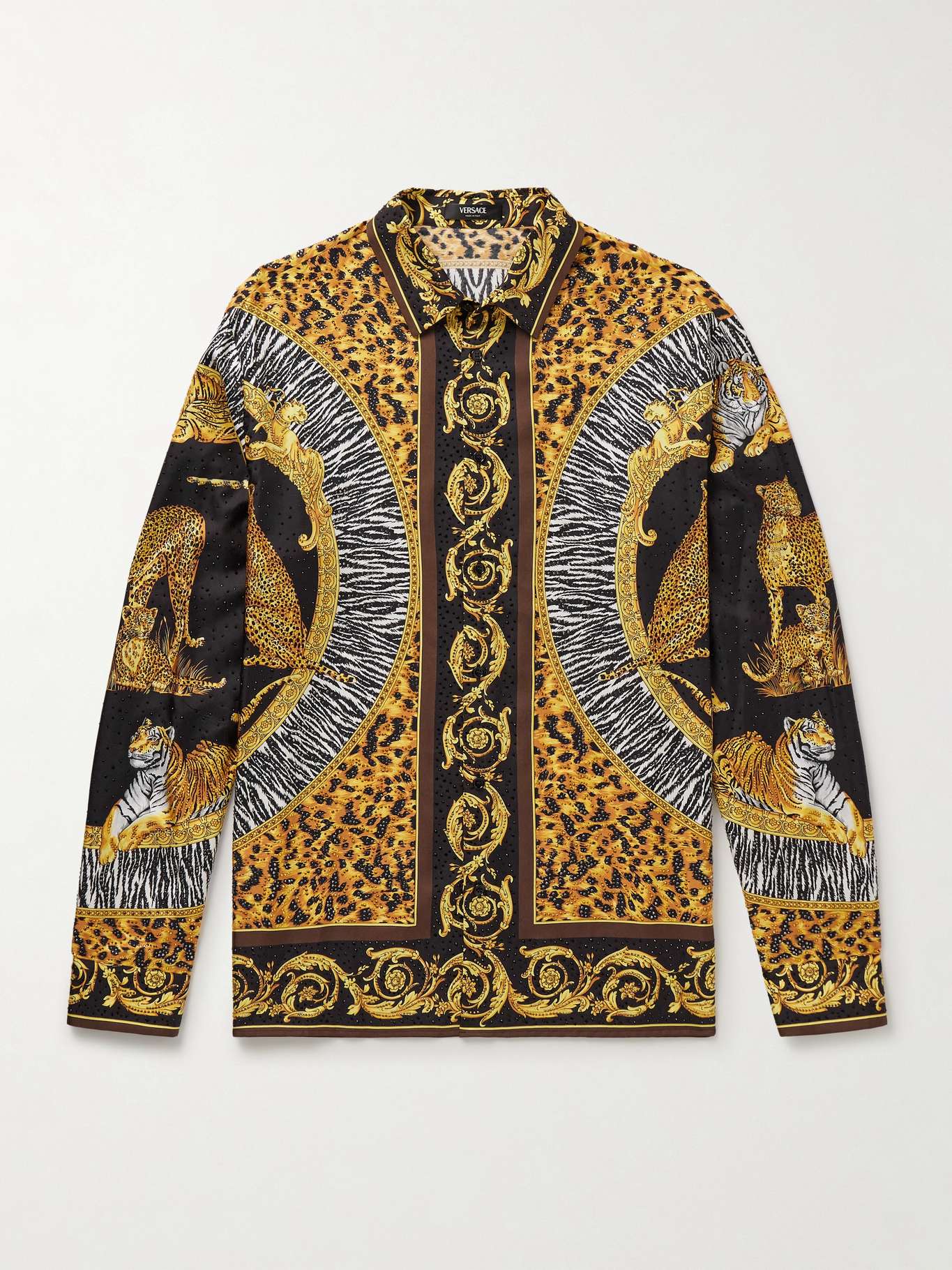 Versace's 'Wild Cats' shirt is printed with a reimagining of one of the house's archival motifs. It's cut from fluid silk and embellished with scores of light-catching crystals.