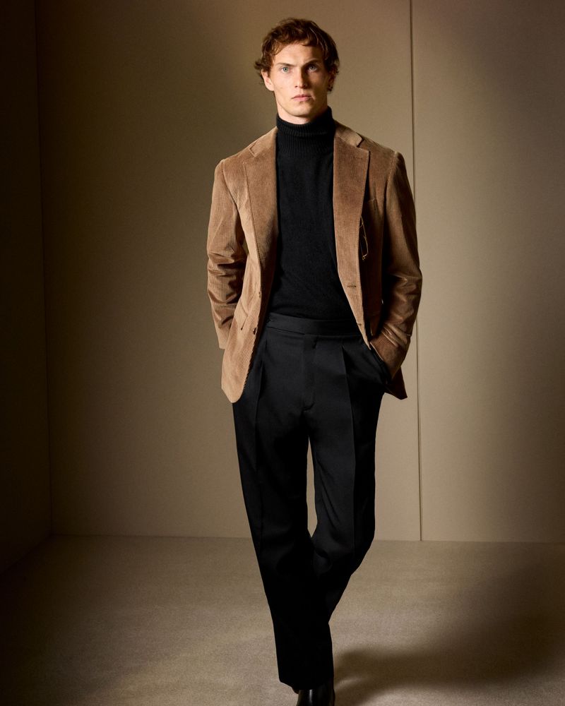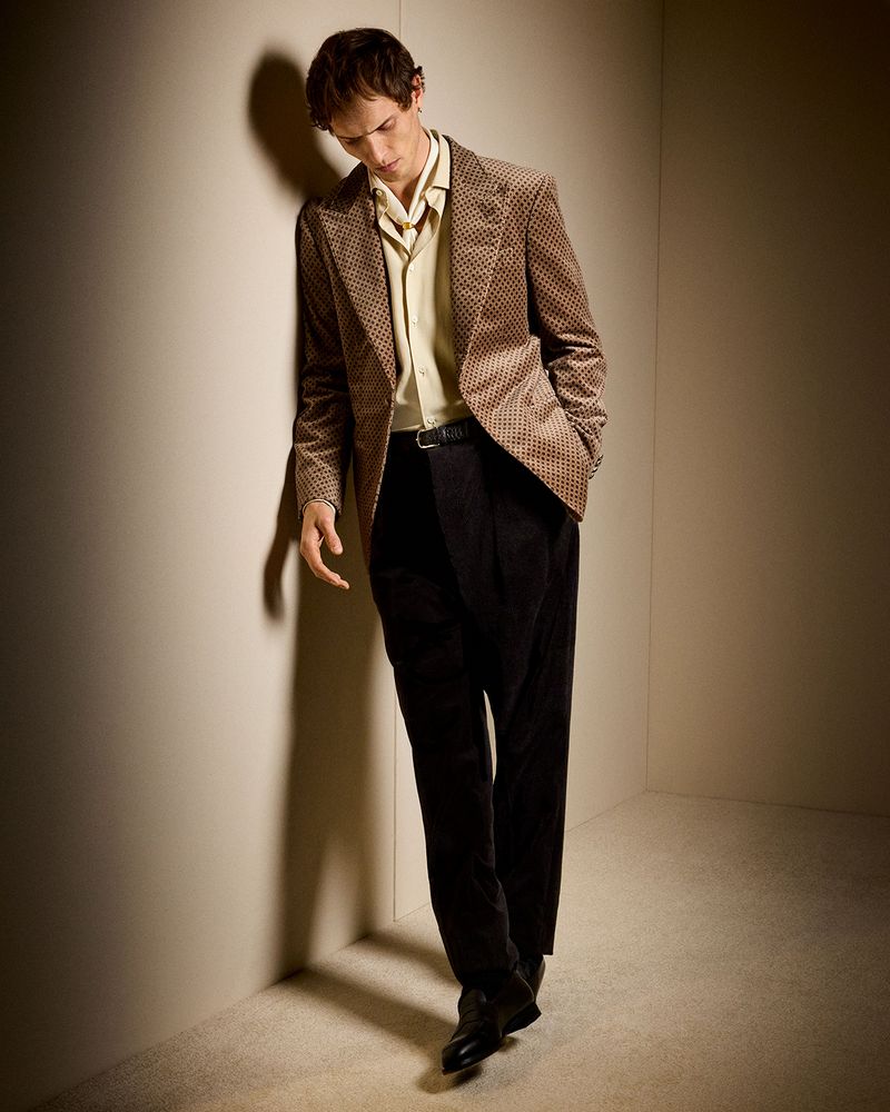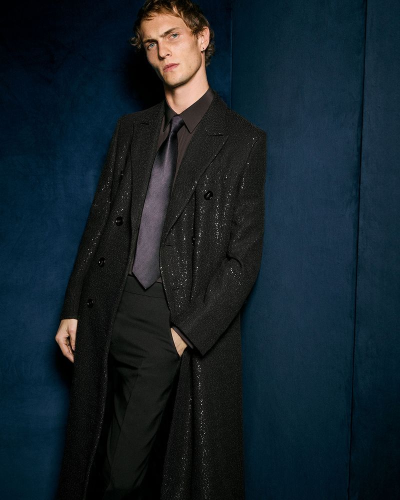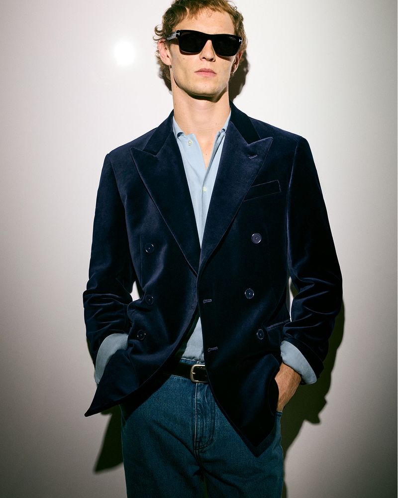 For a glamorous late-night approach, try a statement TOM FORD coat embellished with sequins, or a dark suit in a mohair-mix. Mohair is a stiff, slipper fibre with a natural lustre. When used for tailoring, the garments glimmer, glow and create pockets of light and shadows as you move. They look particularly good at night when under artificial light, such as you’d find in dimly lit restaurants and bars. When teamed with an open-collared, white dress shirt and black suede loafers, you’ll look like a charming social butterfly, even if you secretly harbour a bit of Larry David’s introversion.