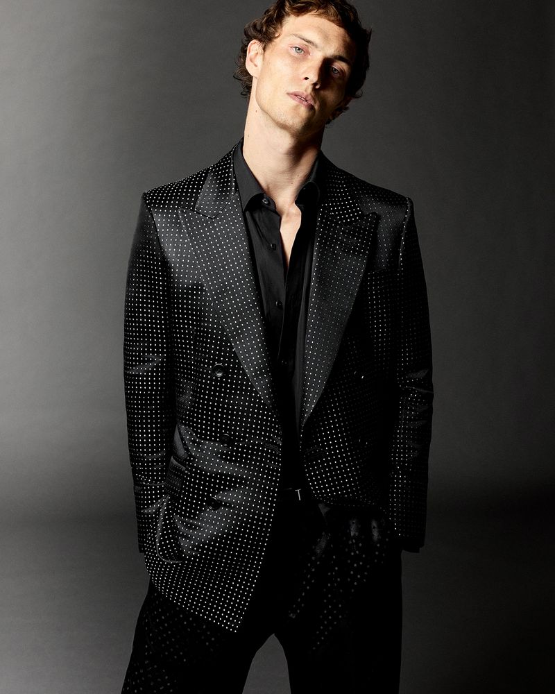 Figuring out black tie can feel like learning a forgotten language, but you can simplify the process by following some easy steps. First, you obviously need a black-tie rig (or tuxedo, in the American parlance). A peak lapel will feel a little more formal, whereas a shawl collar conveys the relaxed spirit of smoking jackets. With his new reign at TOM FORD underway, Haider Ackermann looks set to be the new king of contemporary eveningwear with a bit of attitude, including a standout polka dot double-breasted tux in mulberry silk and satin.