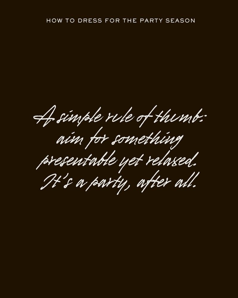 Trading hard written dress codes for softly coded norms has made knowing what to wear to work more confusing than ever. Deciphering how to dress appropriately often means observing the cues in your office. Holiday parties, however, present a unique challenge. They’re annual and rare, making it harder to know where the line falls. A simple rule of thumb: aim for something presentable yet relaxed. It’s a party, after all.