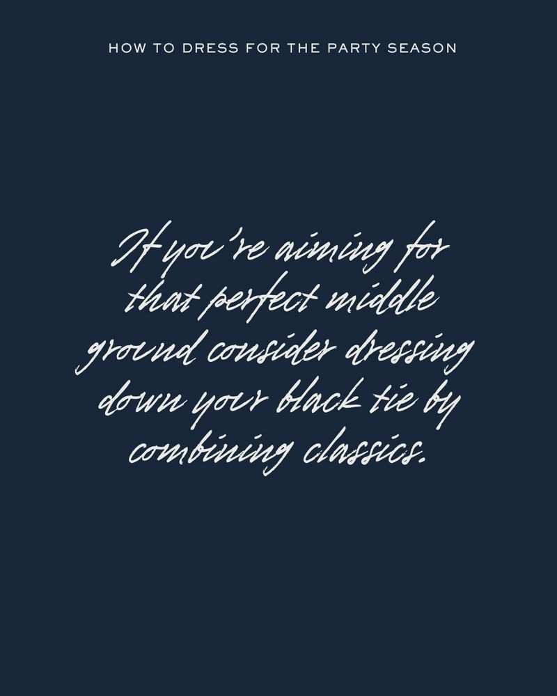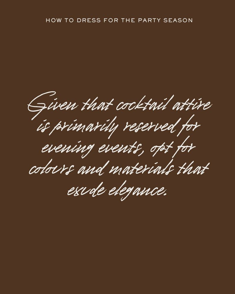 The challenge, really, is getting through the next month or so. Between shopping for presents, meeting end-of-year work deadlines and the inevitable winter travel delays, social commitments can feel more like a burden than bliss. Plus, you have to figure out what to wear for these gatherings. What’s appropriate for the office party? How does one do “black tie”? And what exactly does “cocktail attire” mean? Rest assured – we’re here to guide you through the finer points of festive dressing with ease and clarity.