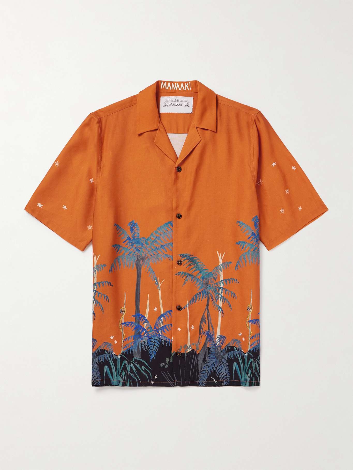 EXCLUSIVE AT MR PORTER. Part of Manaaki's "The Simple Life" collection, this shirt is printed with a row of palm trees set against a vivid orange sunset. It's cut for a boxy fit from a soft Lyocell and linen-blend and has a relaxed camp collar.