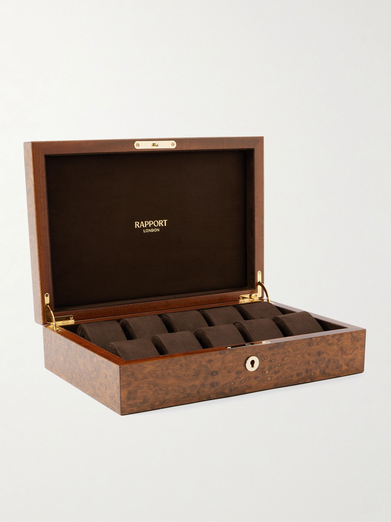 Rapport London's 'Heritage' watch box is crafted from burr walnut treated with a lacquered finish applied meticulously by hand. The suede interior boasts space for ten watches with matching cushions for each. It secures with a traditional silver-tone lock and key.