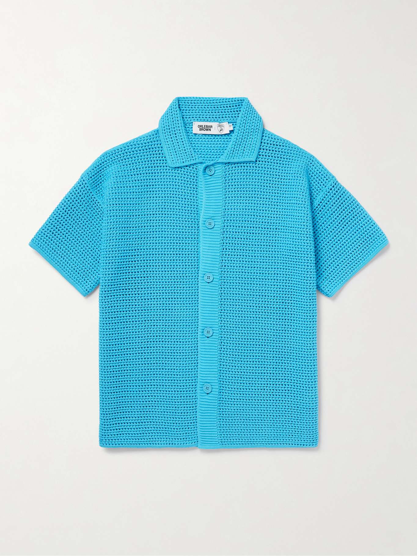 The details of Automobili Lamborghini's iconic cars inspire Orlebar Brown's capsule collection. This open-knit shirt is made from lightweight organic cotton in a reticolo pattern and comes in a bold 'Synth Blue' shade.