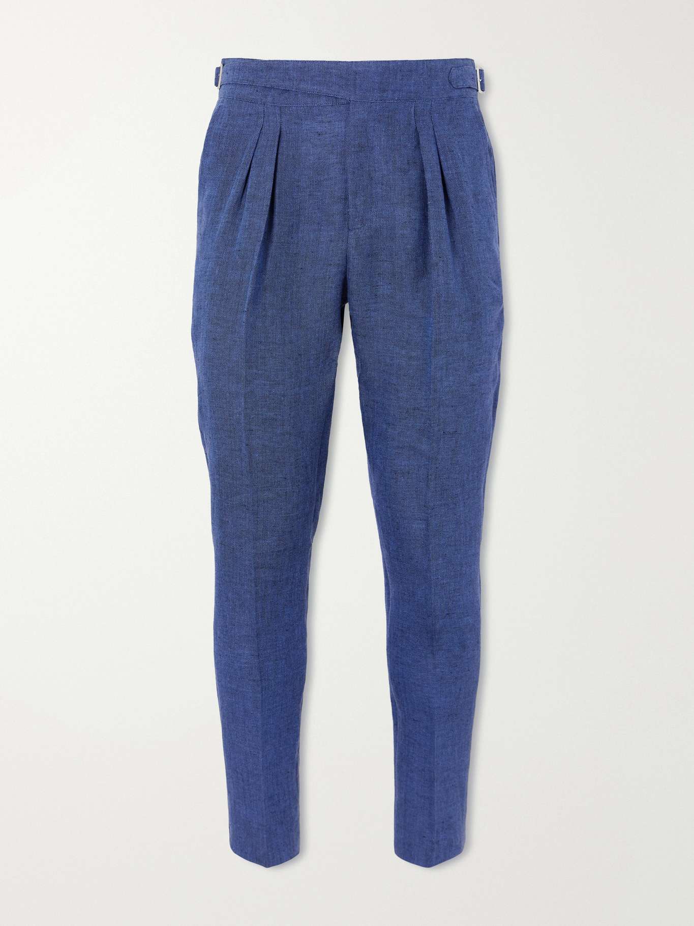 DESIGNED BY MR PORTER. Mr P.'s 'Steve' trousers are tailored for smart-casual settings. Cut from breathable linen woven in a subtle herringbone pattern, they have double front pleats and a tapered leg that sharpens the silhouette, while an extended waistband and adjustable side tabs ensure a neat finish.