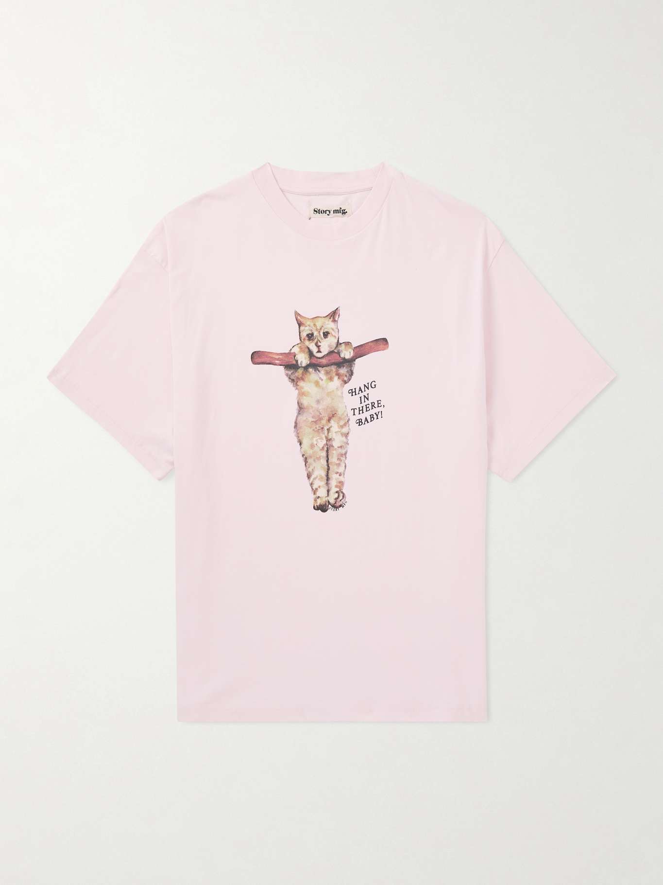 Story Mfg.'s T-shirt is a reminder to 'Hang in there'. Cut for a roomy fit from cotton-jersey, it's printed with a painterly illustration of a tabby cat with paws clinging on to a tree branch.
