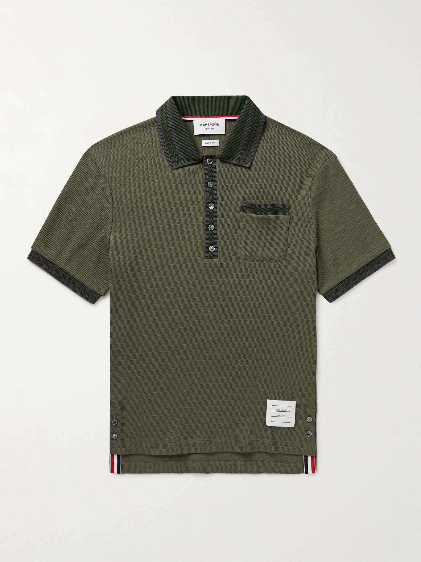 Thom Browne's polo shirt is designed with plenty of signature details like a logo patch and button-fastening side slits trimmed with tricolour grosgrain. It's pointelle-knitted from cotton and finished with contrasting stripes.