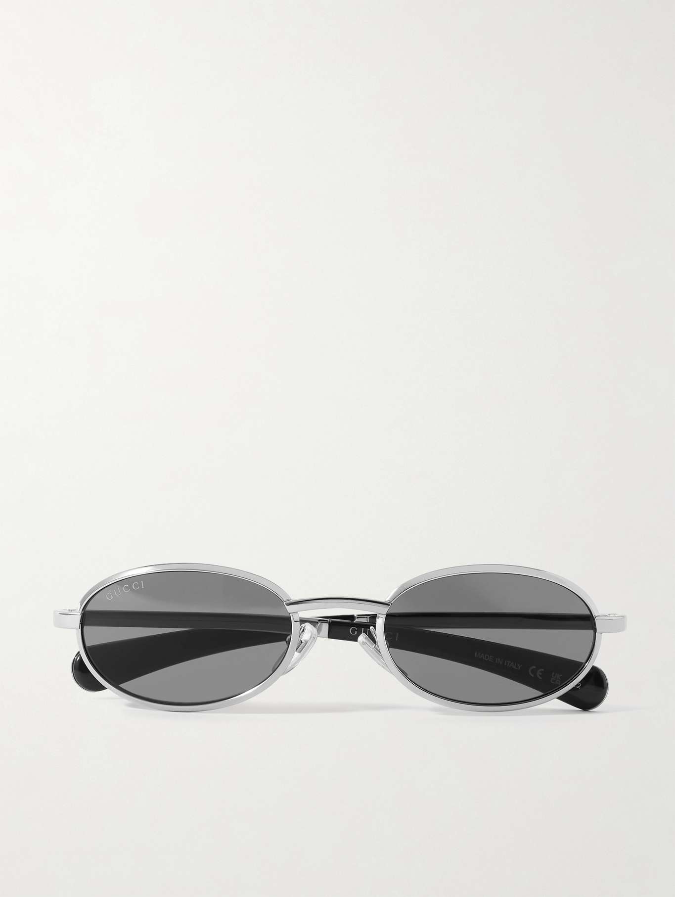Gucci's sunglasses have sleek, oval frames that are reminiscent of '90s styles. They've been crafted in Italy from silver-tone metal and detailed with the brand's etched logo along the arms.