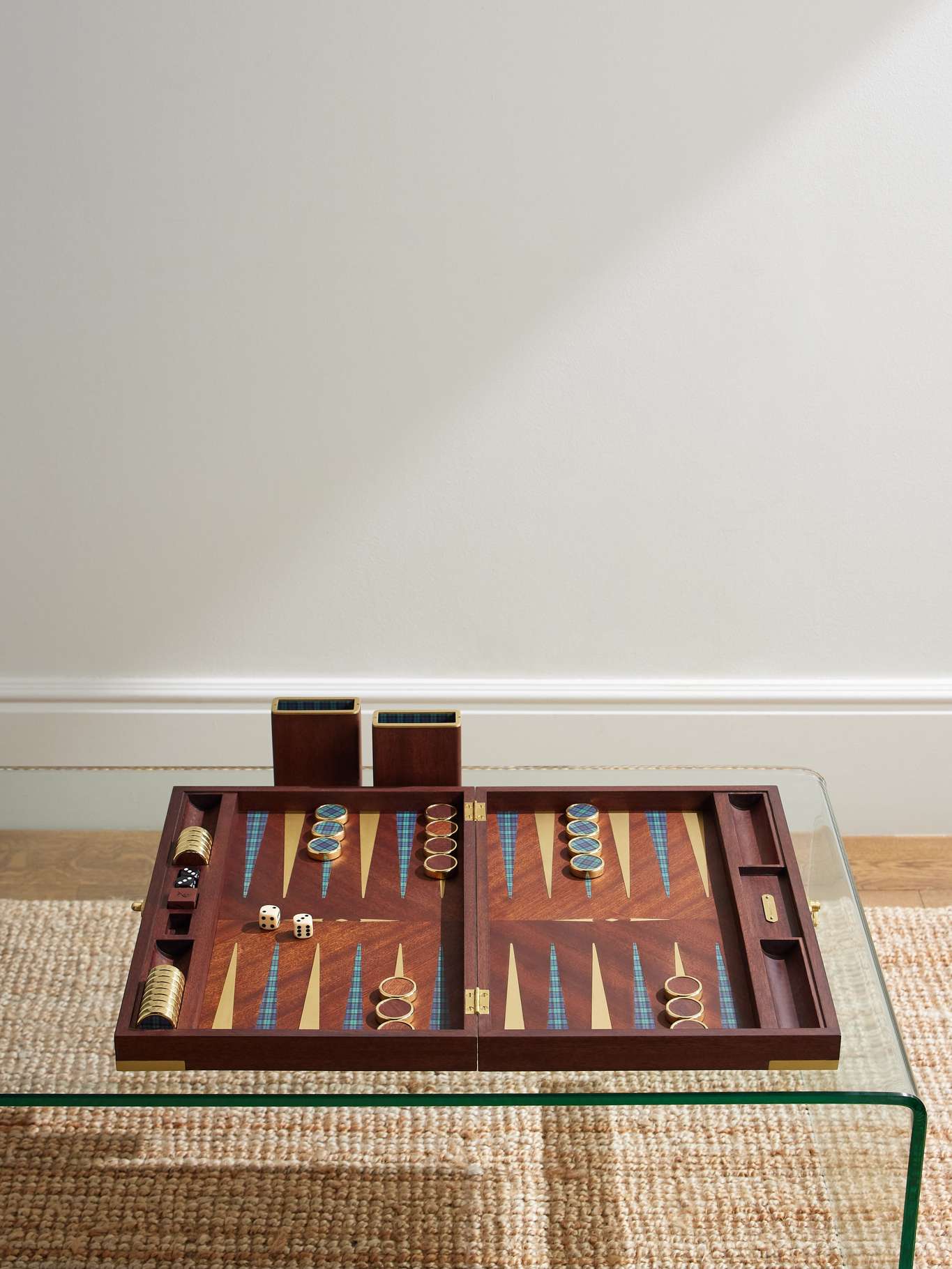 Ralph Lauren Home puts its signature spin on traditional games, resulting in this fully-equipped, rich mahogany 'Parkwood' set. Designed for both backgammon and chequers, it comes with solid and tartan-inlaid pieces - framed by polished gold-tone brass - two dice sets, cups and one doubling cube.