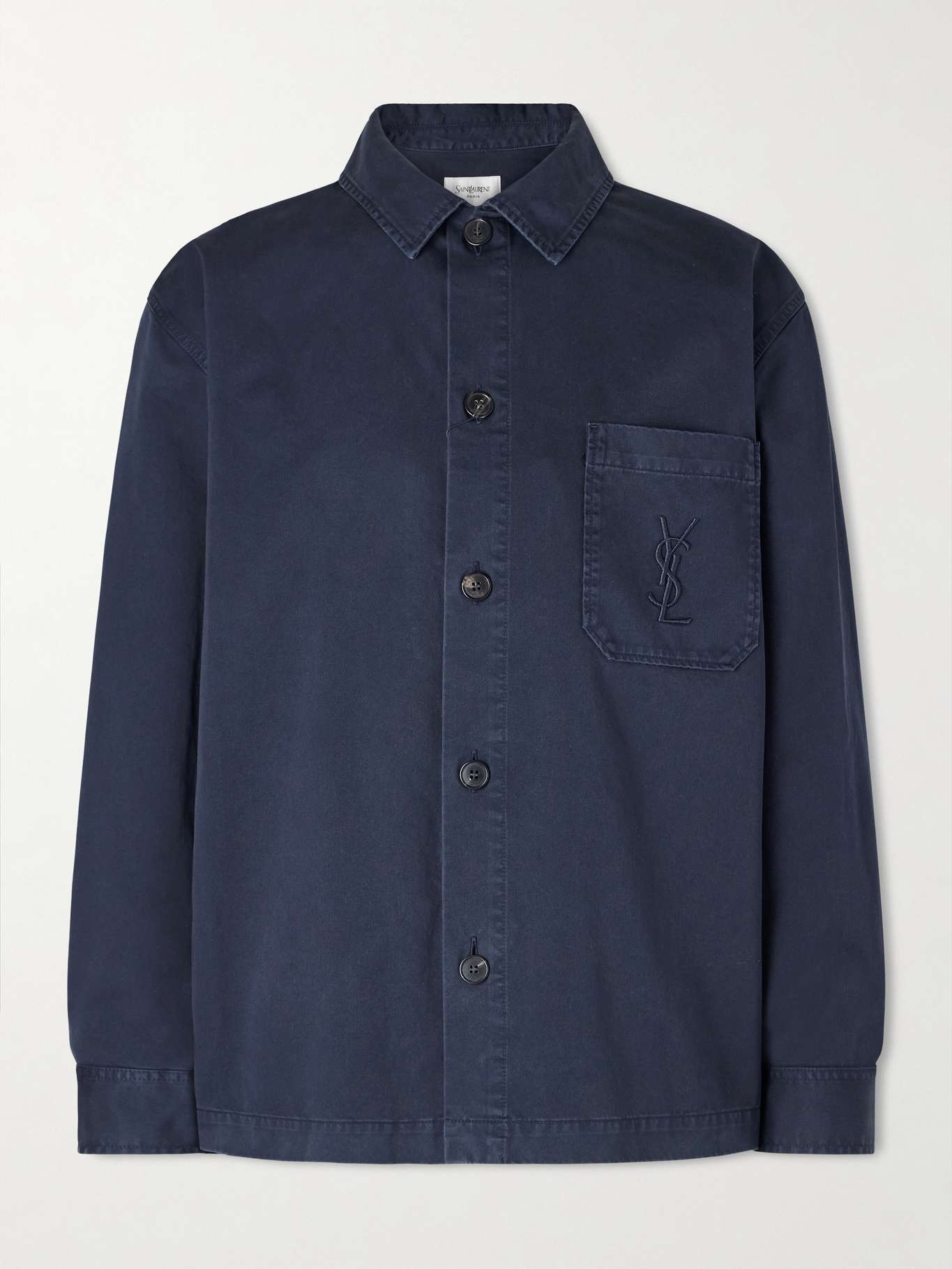 SAINT LAURENT's overshirt is cut from navy cotton-twill that's reminiscent of classic workwear. It has a chest patch pocket embroidered with the house's initials in tonal thread.