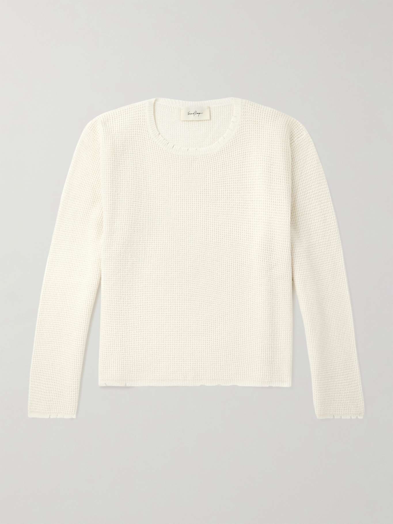 SECOND / LAYER founders Ant De Padovane, Jacob Willis and Joshua Willis treat their hometown, LA, as their muse. Part of the AW25 offering, this sweater is knitted from a sumptuous blend of wool and cashmere and is designed to look like vintage, with artful distressing along the crew neckline, hem and cuffs.