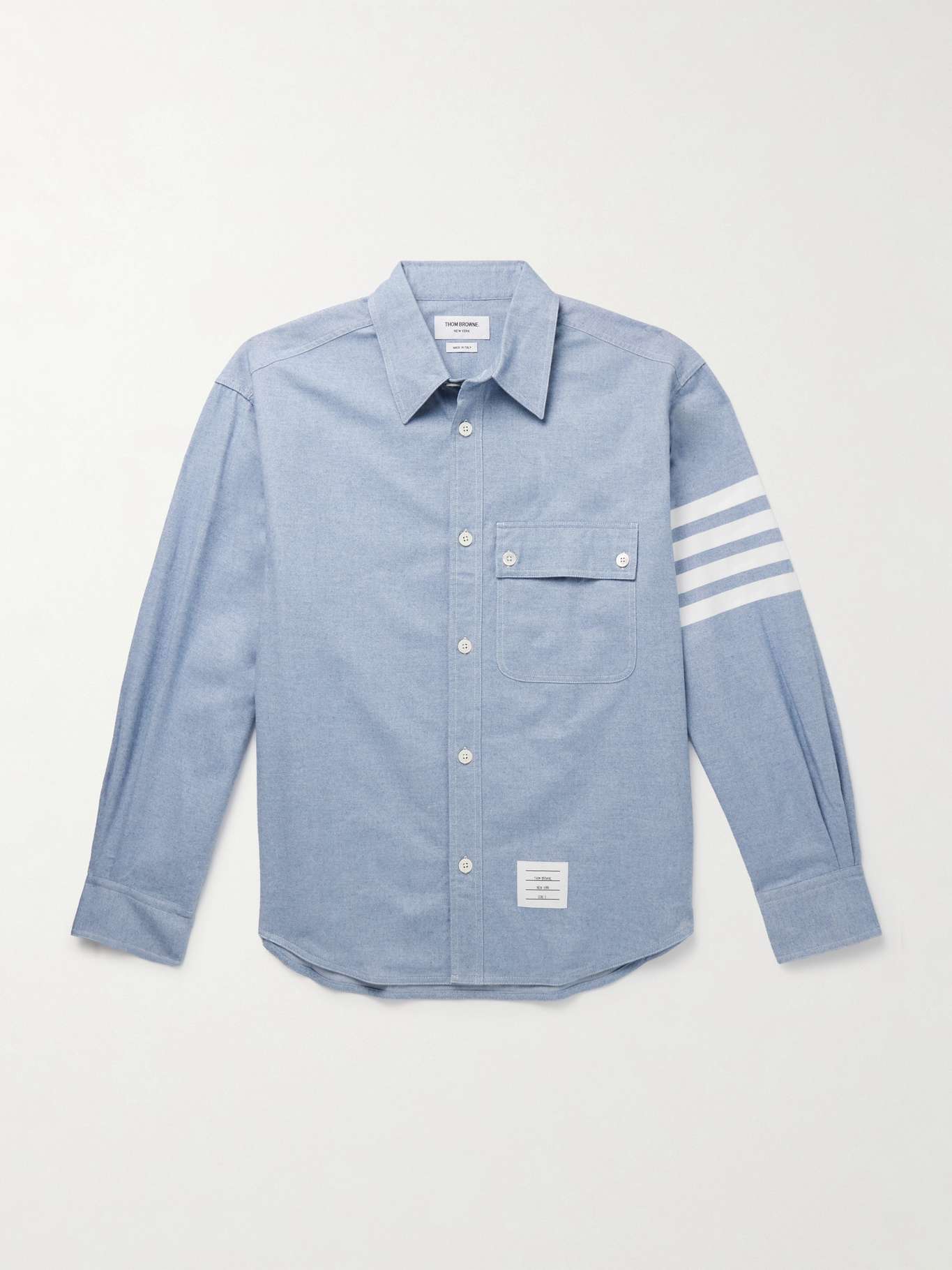 Just one look and you can tell this shirt is quintessentially Thom Browne, thanks to its '4-Bar' stripes, appliquéd label and striped grosgrain tab at the back. It's cut for an oversized fit from cotton-flannel and fastens with mother-of-pearl buttons.