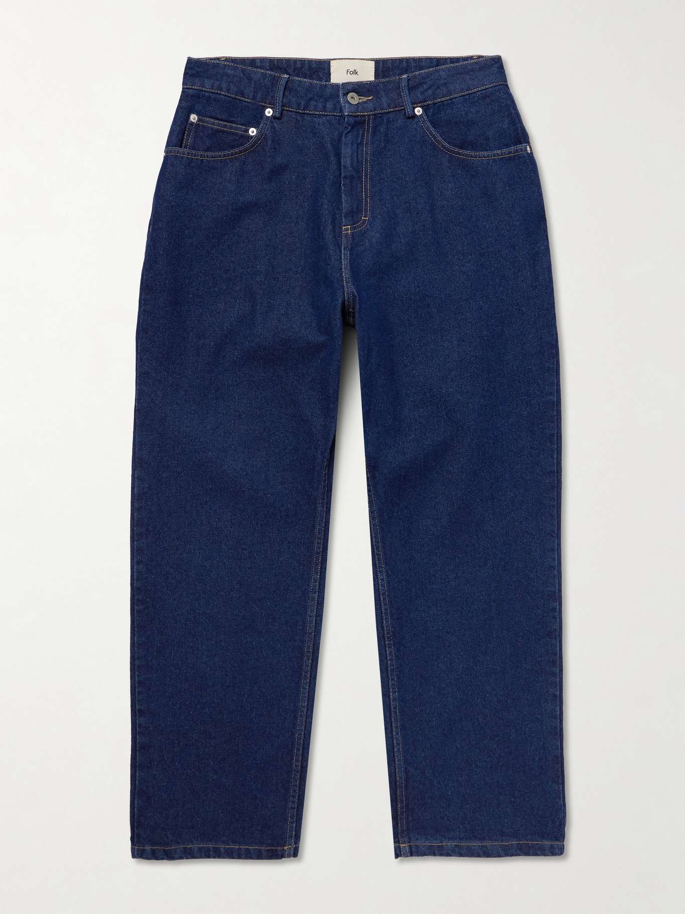 Folk's jeans are designed with room around the thighs to create a subtle barrel-leg shape. They're cut from raw denim with a slubby texture and have classic camel stitching.
