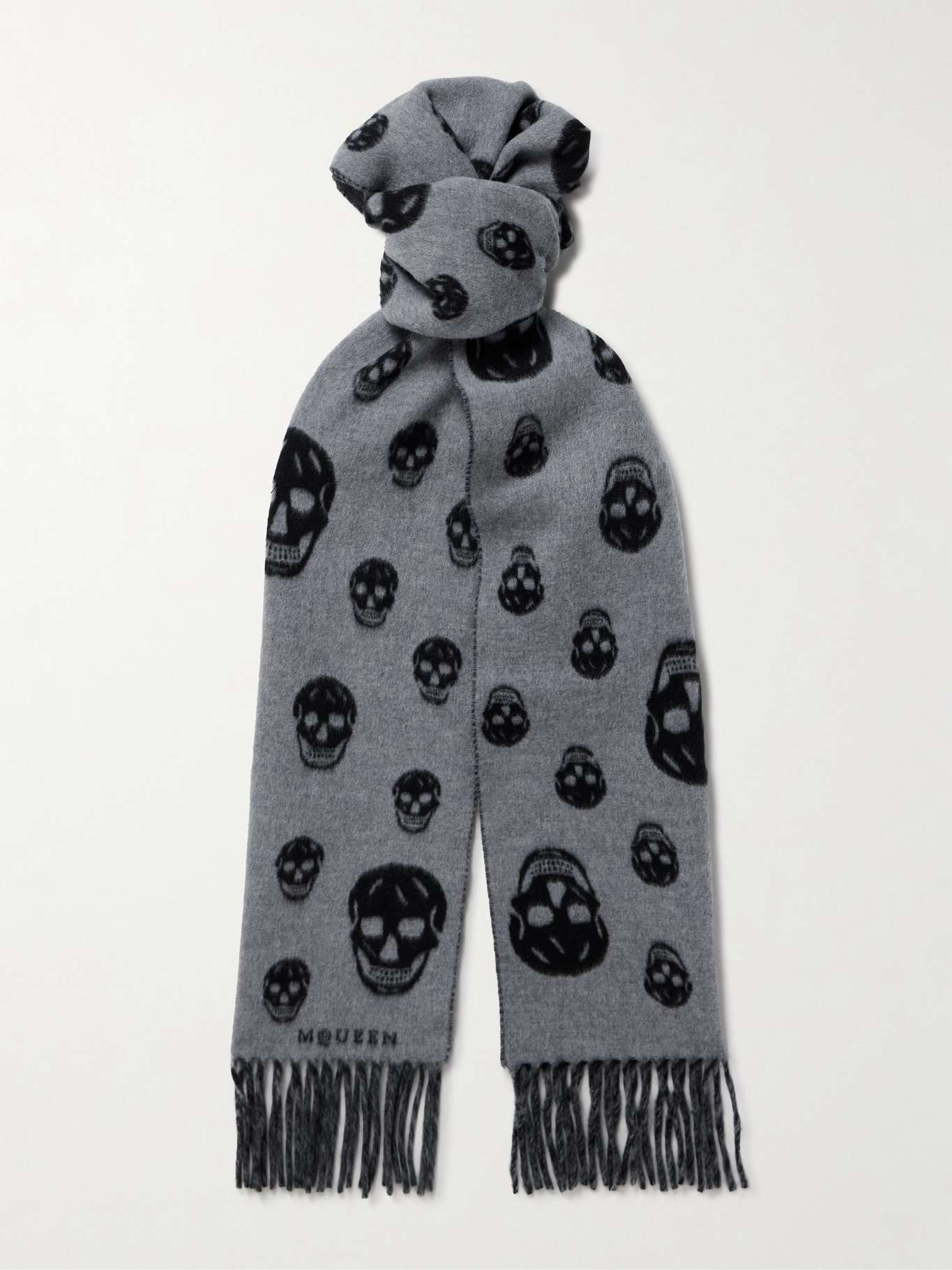 The intarsia-knit skulls mapping McQueen's scarf are an unmistakable signature that nods to the label's macabre spirit. It's knitted from sumptuous wool and cashmere-blend and finished with fringed ends.