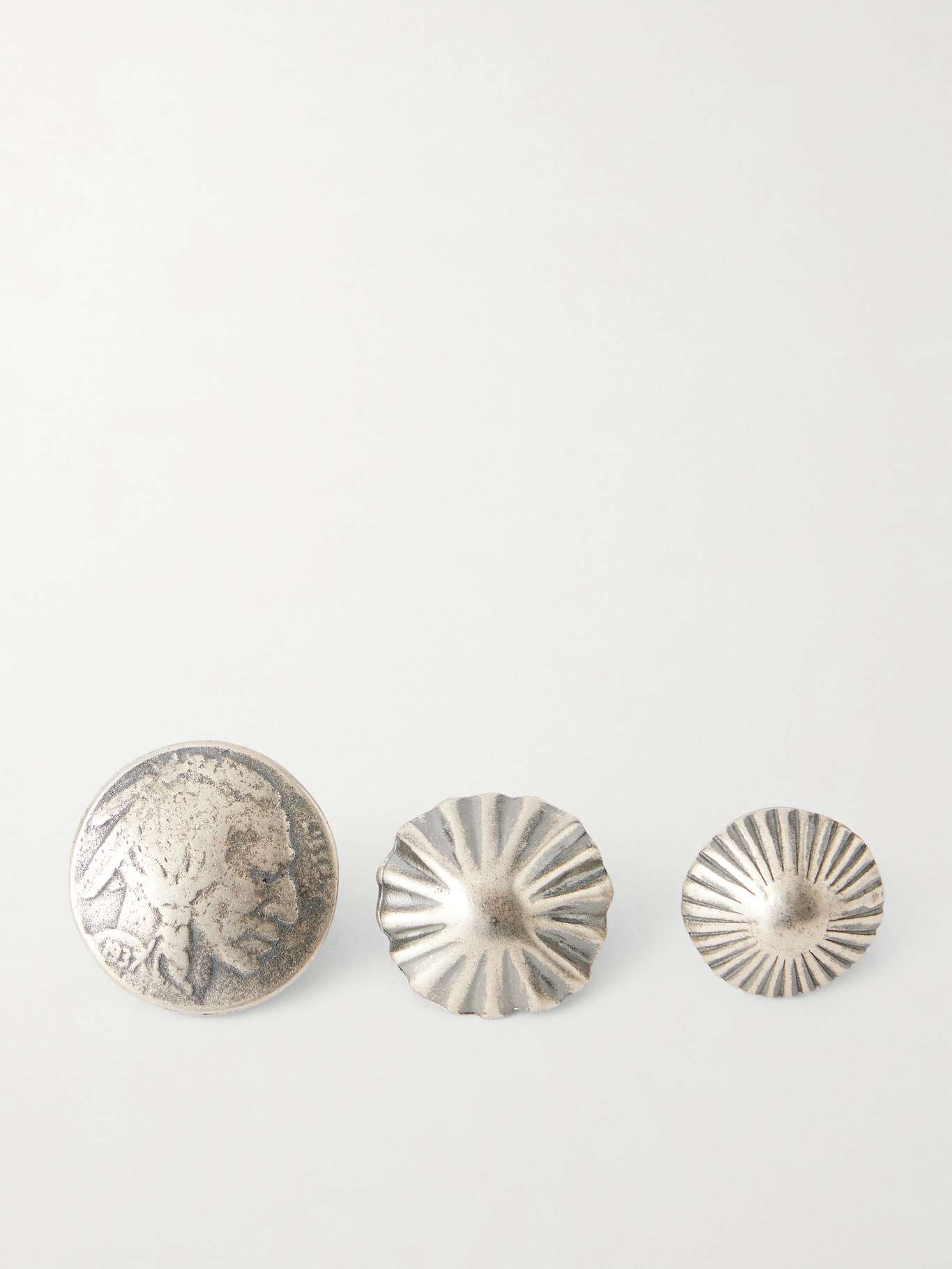 Peyote Bird's jewellery is rooted in the spirit and traditions of the American Southwest. Available in a set of three, these 'Foundry' pins are made by skilled craftspeople from antiqued silver and intricately engraved.