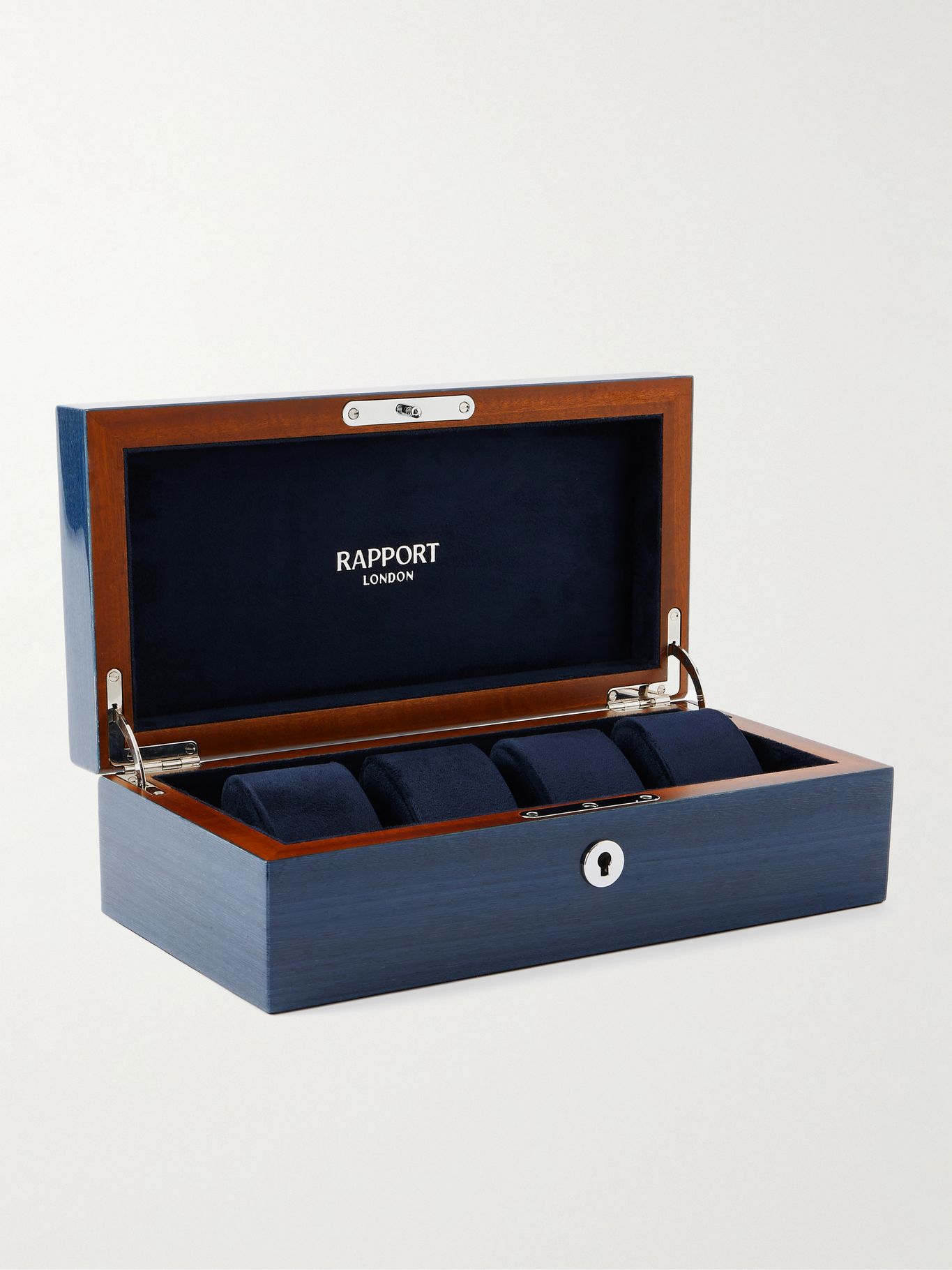 Rapport London's 'Heritage' watch box is crafted from solid navy cedar treated with a lacquered finish applied meticulously by hand. The suede interior boasts space for four watches with matching cushions for each. It secures with a traditional silver-tone lock and key.
