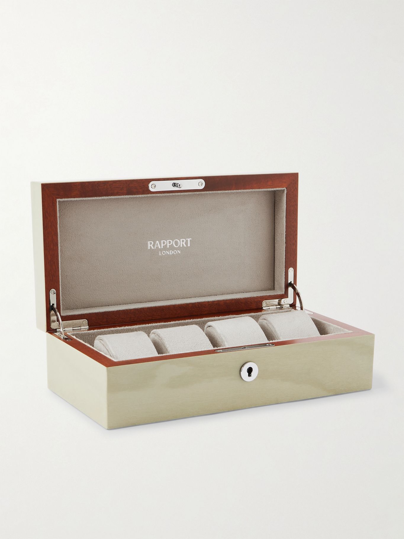 Rapport London's 'Heritage' watch box is crafted from solid light-grey cedar treated with a lacquered finish applied meticulously by hand. The suede interior boasts space for four watches with matching cushions for each. It secures with a traditional silver-tone lock and key.