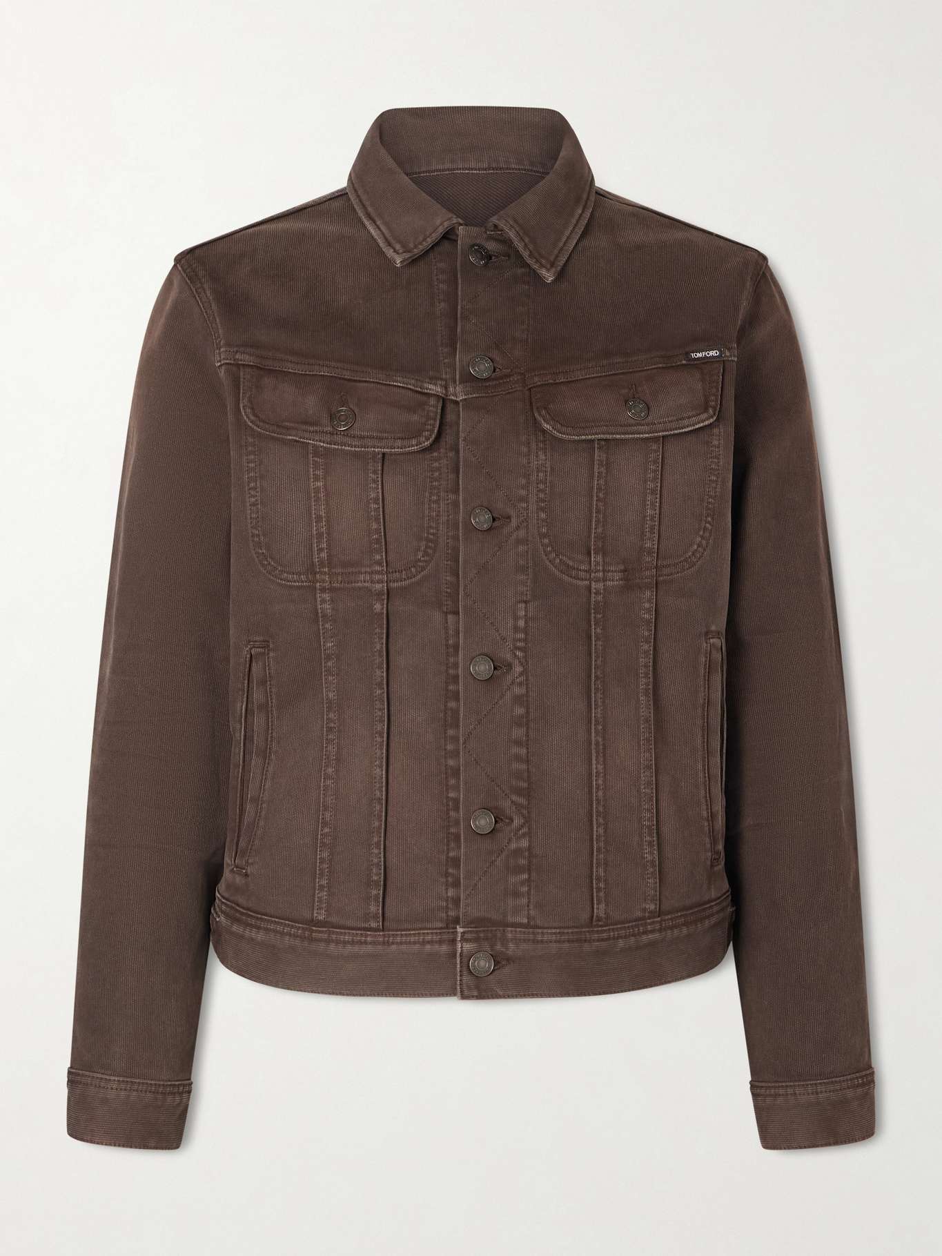TOM FORD's jacket is lightly faded along the chest and waist for a lived-in finish. It's been made from panels of cotton-blend canvas that's woven with micro cords. Note the discrete logo tag above the flap pocket.